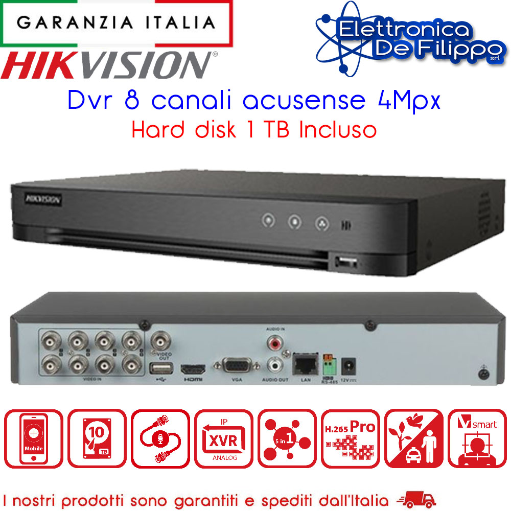 DVR Hybrid 8 CH self-adaptive HDTVI 3MP /AHD 2MP/HD CVI 2MP/IP/CVBS, accetta fino a 4 telecamera IP a 6MP, fino a 12 Canali. risoluzione analogica TVI fino a 3MP@15Fps, compressione video H.265+/H.265/H.264+/H.264, uscita video HDMI - VGA - CVBS, I/O audio 1/1, 1 RJ45 10M/100M, protocolli di rete TCP/IP, PPPoE, DHCP, Hik-Connect, DNS, DDNS, NTP, SADP, NFS, iSCSI, UPnP, HTTPS, ONVIF. Supporta controllo PTZ via Omnicat, sino a 128 connessioni simultanee, supporta accesso a Hik-Connect. 1 HDD sata fino a 10TB , 2 porte USB 2.0, 1 RS485 ,alimentazione 12VDC, temperatura di funzionamento -10 °C to +55 °C, assorbimento 7W. Dati Up to coax, Regole SMART:Intrusion detection, line crossing detection, VQD. Playback sincronizzato 8ch. Canale audio remoto 1ch.
