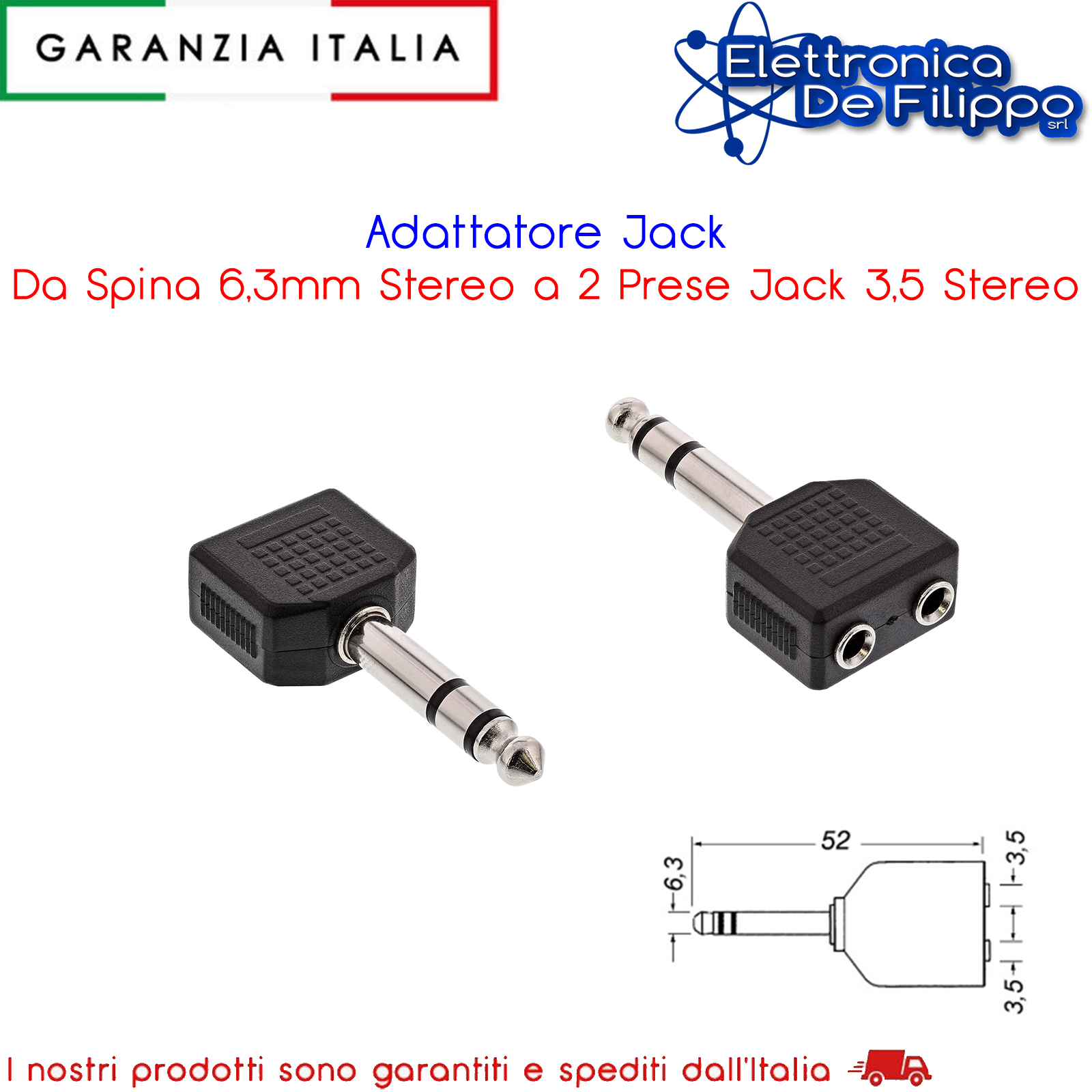 Adattatore Jack Da Spina 6,3mm Stereo a 2 Prese Jack 3,5 Stereo
