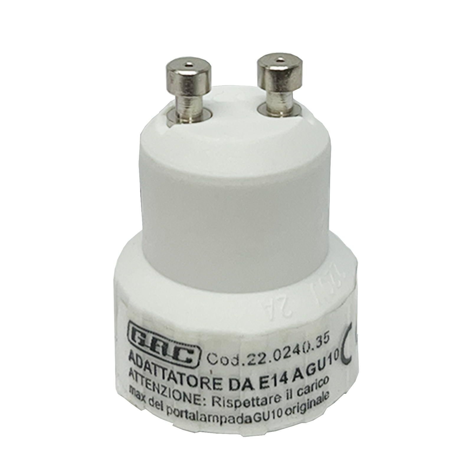 Adattatore per lampade da E14 a portalampada GU10, tensione 250Vac, corrente max 2A, potenza max applicabile 50W. Colore Bianco
