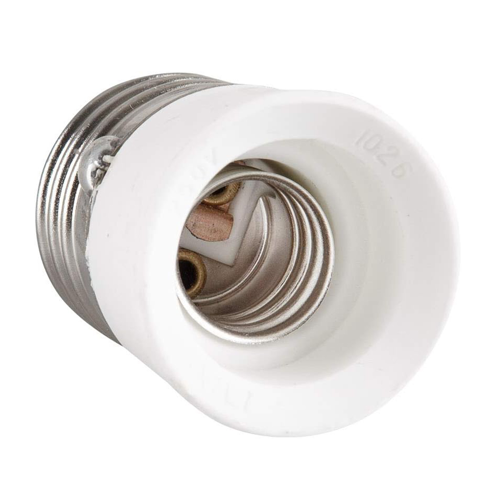 Adattatore per lampade da E14 a portalampada E27, tensione 250Vac, corrente max 2A, potenza max applicabile 50W. Colore Bianco