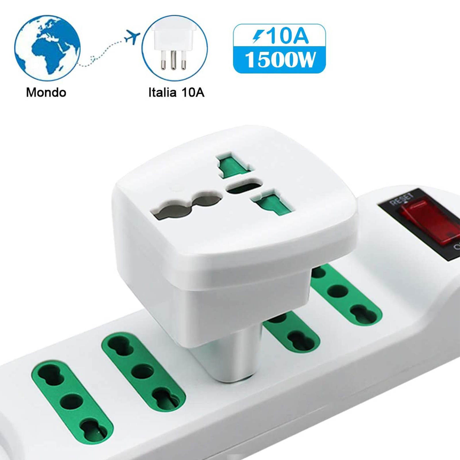 Adattatore elettrico con prese universali (UK/USA/AU) e spina EU 10A. Blocco di sicurezza inserimento singola spina e sicurezza da inserimento accidentale. Prese con alveoli schermati anti infortunistici. Essendo privo di terra, è possibile utilizzarlo solo con dispositivi di classe 2. Carico massimo 1500W