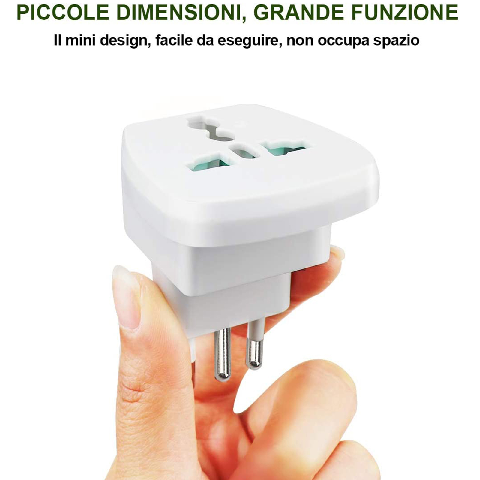 Adattatore elettrico con prese universali (UK/USA/AU) e spina EU 10A. Blocco di sicurezza inserimento singola spina e sicurezza da inserimento accidentale. Prese con alveoli schermati anti infortunistici. Essendo privo di terra, è possibile utilizzarlo solo con dispositivi di classe 2. Carico massimo 1500W