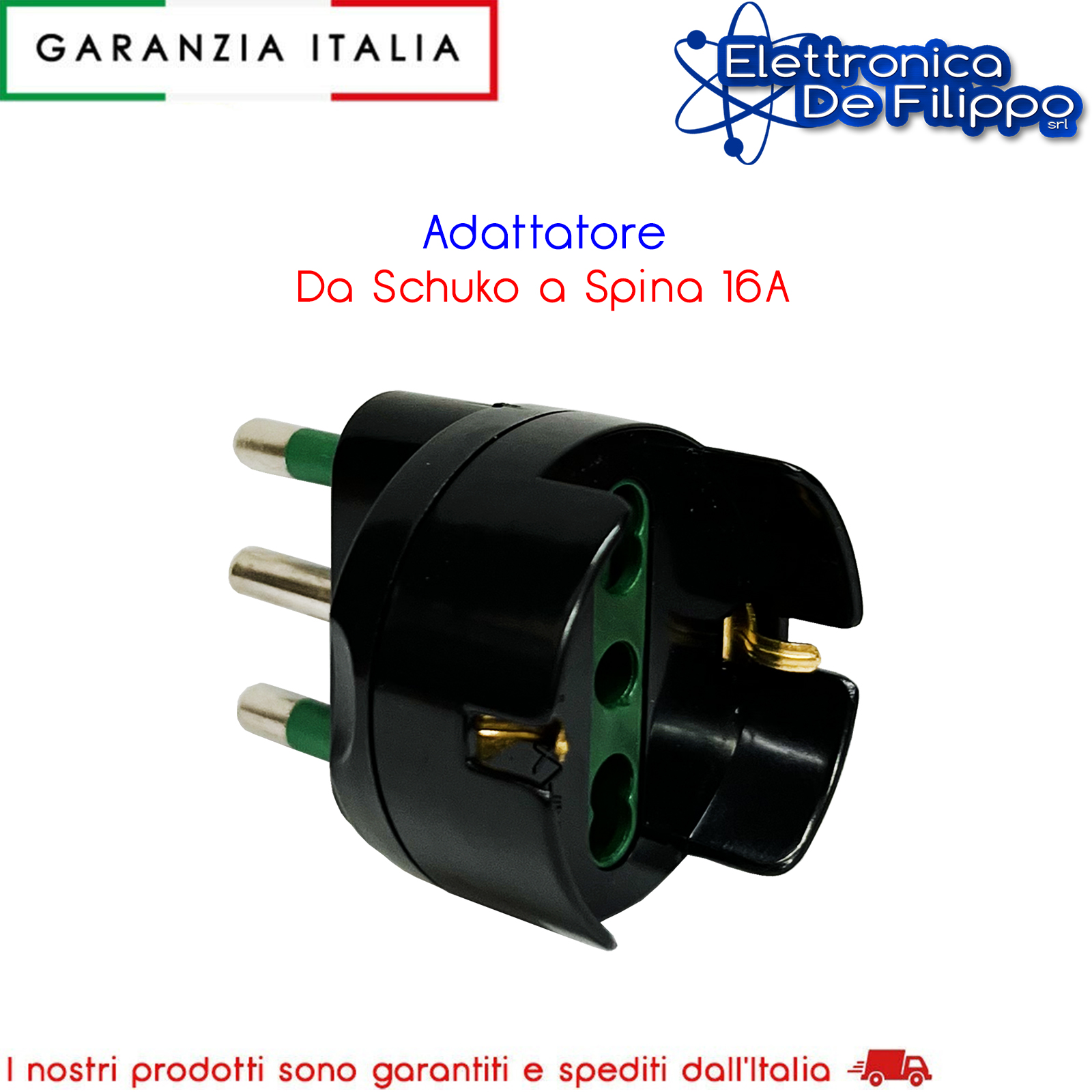 Adattatore da spina 16A a presa Schuko 16A. Con protezione bambini, potenza massima supportata 1500 W.