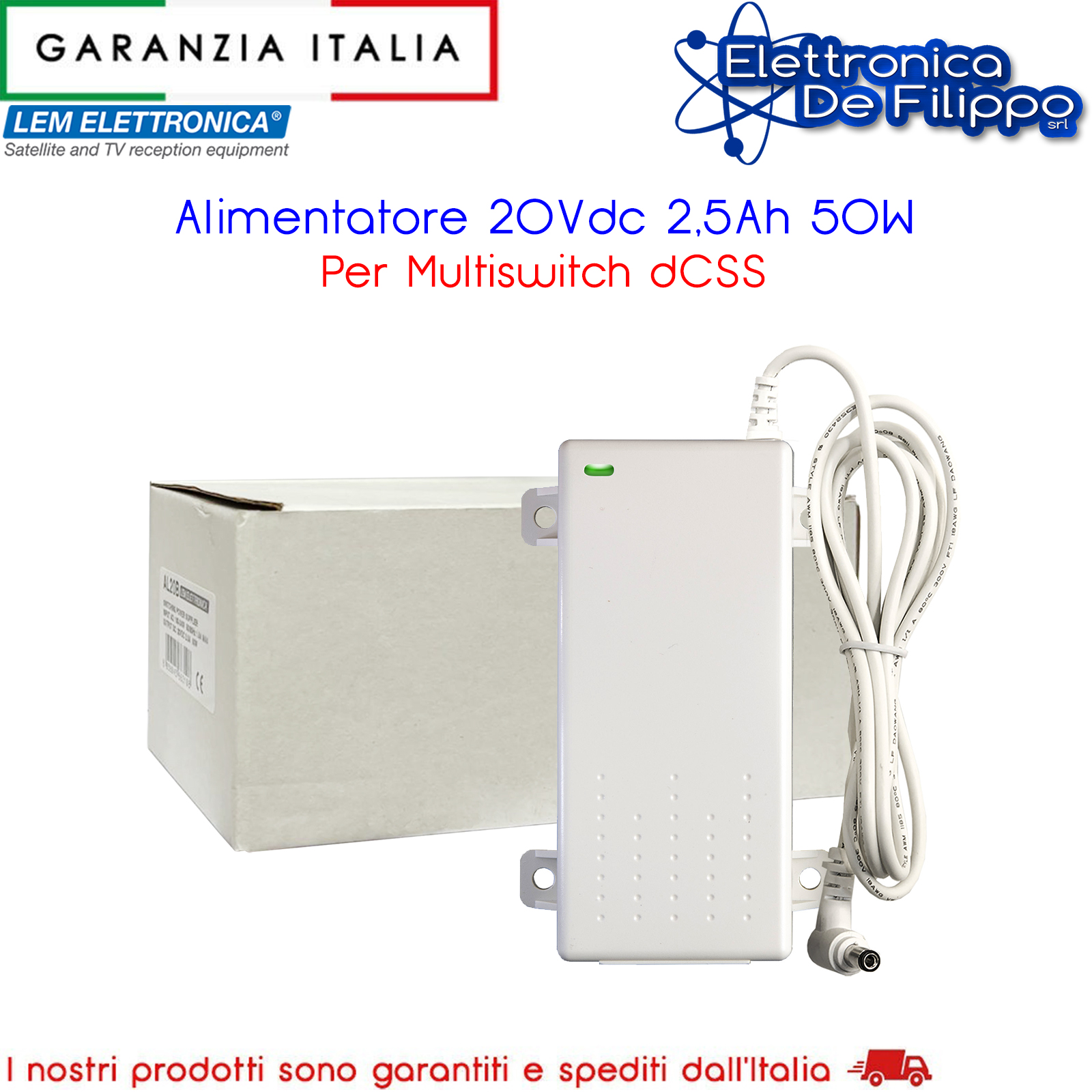 Alimentatore switching ingresso AC 100-240V 50/60 Hz Uscita DC 20V 2,50A / 50W ad alto rendimento idoneo per l’alimentazione diretta dei multiswitch dCSS con presa DC integrata. Dispone di staffe integrate per il fissaggio a parete.