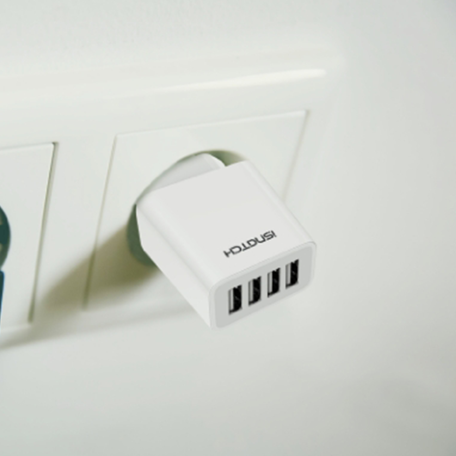 Alimentatore con 4 uscite USB per Smartphone, iPhone, iPad, Tablet ed altri dispositivi USB. Corrente in uscita max totale 4,5A, su singola porta 2A, potenza max 22,5W. Circuito di protezione da sovraccarichi.