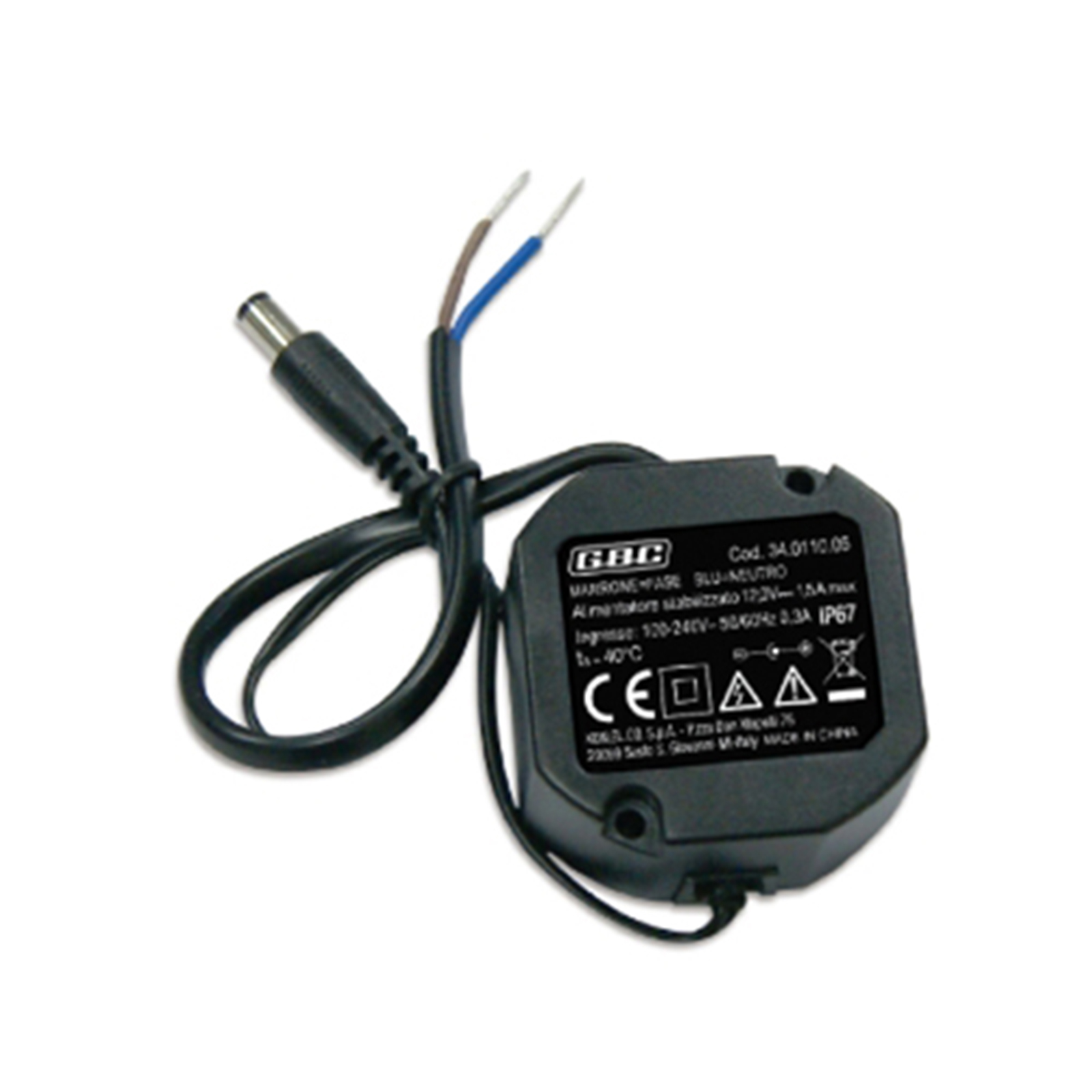 Alimentatore da incasso switching 12V 1,3A resinato con grado di resistenza IP67; adatto per impieghi in impianti di videosorveglianza CCTV. Installabile direttamente in scatole di derivazione. Il cavo d'uscita è provvisto di connettore 2,1 x 5,5 mm
