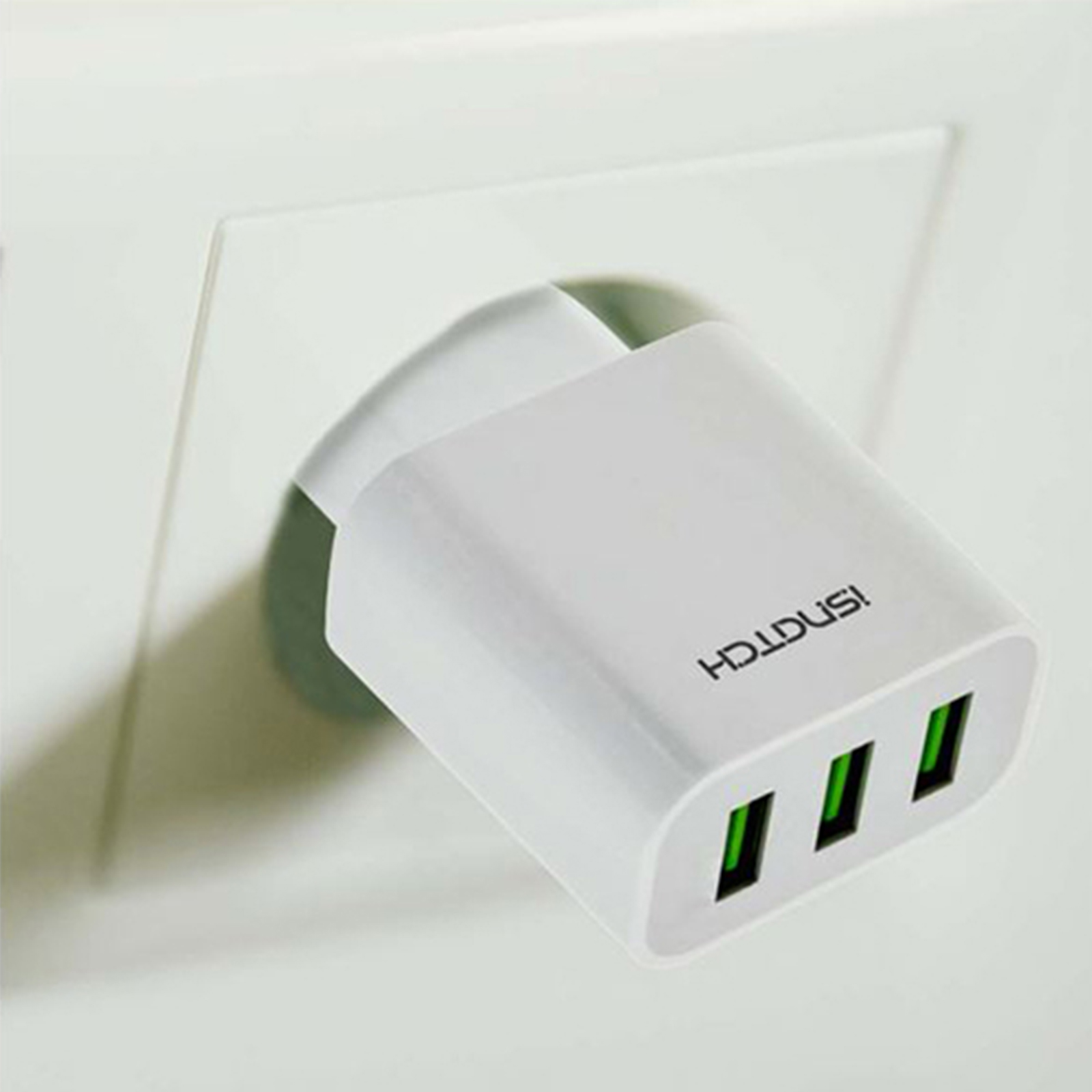 Alimentatore 100-240V~ con 3 uscite USB per Smartphone, iPhone, tablet e altri dispositivi USB. Di dimensioni ridotte, questo comodo alimentatore USB consente di ricaricare i vostri dispositivi in modo rapido ed efficace a casa, in ufficio o in qualsiasi luogo vi troviate. La struttura compatta lo rende la soluzione ideale per ricaricare il vostro iPad o iPhone in qualsiasi circostanza. Corrente in uscita max totale e su singola porta 3A, potenza max 15W; usando più porte contemporaneamente la corrente si distibuirà sulle porte utilizzate, ad esempio 2A + 1A su due porte, o 1A ciascuna su tre porte. Sarà sufficiente collegare l’adattatore alla presa di corrente e all’iPhone o iPad (cavo non incluso) per iniziare il processo di ricarica. Circuito di protezione da sovraccarichi.