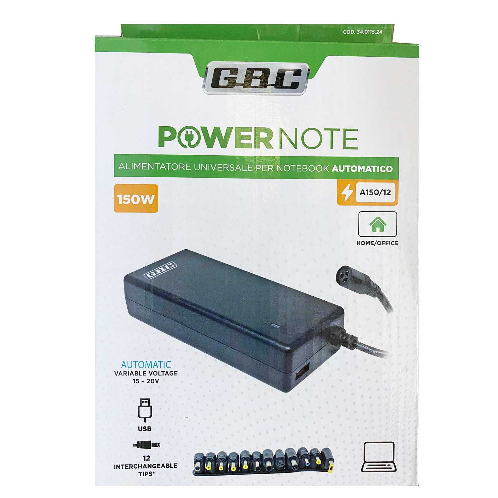 Alimentatore switching per NoteBook a tensione variabile automatica. Potenza massima 150W e corrente da 5A a 8A. E' dotato di 12 Spinotti intercambiabili, una volta selezionato lo spinotto necessario tra quelli disponibili, l'alimentatore imposterà la tensione automaticamente.