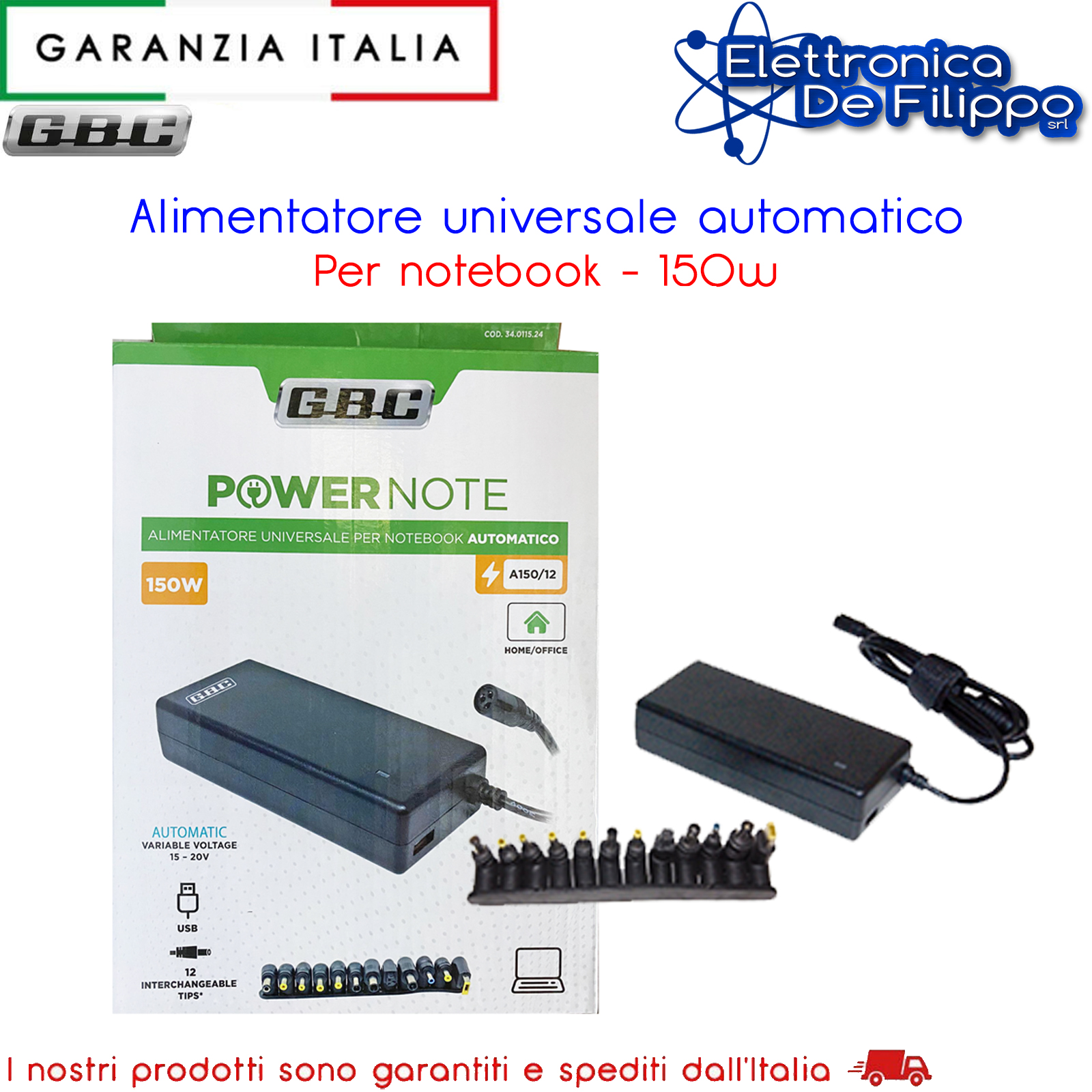 Alimentatore switching per NoteBook a tensione variabile automatica. Potenza massima 150W e corrente da 5A a 8A. E' dotato di 12 Spinotti intercambiabili, una volta selezionato lo spinotto necessario tra quelli disponibili, l'alimentatore imposterà la tensione automaticamente.