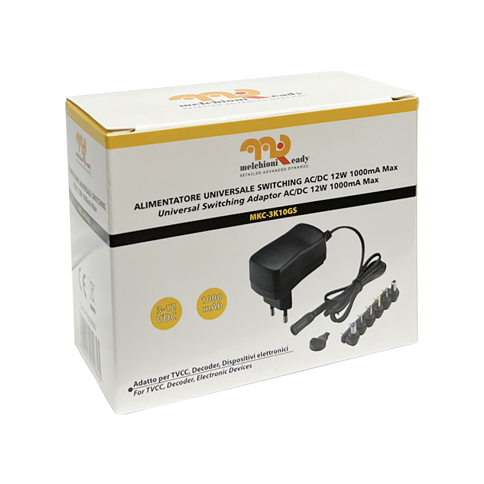 Alimentatore a tensione variabile per usi generali. Tensioni in uscita selezionabili manualmente 3-4,5-5-6-7,5-9-12 Vdc. Potenza massima in uscita 12W. Corrente in uscita costante di 1A. Kit di 6 spinotti intercambiabili incluso 3,5x1,35mm-5,5x2,1mm-5,5x2,5mm-2,35x0,7mm-4,0x1,7mm-5,0x1,5mm. Polarità selezionabile. Minimo peso e ingombro, con tecnologia switching e LED di accensione, certificato per le nuove norme europee di risparmio energetico. Ingresso da 100-240Vac
