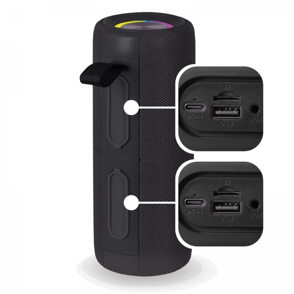L’ Altoparlante 2x15W Wireless 5.3 Micro SD AUX-IN IPX5 Trevi XCS 8A88 B è alimentato da una Batteria al Litio ad alta capacità, garantendoti ore e ore di musica ininterrotta. La ricarica è facile e veloce tramite USB Type-C, così sarai sempre pronto per la prossima avventura sonora. Progettato per la tua comodità, questo speaker è facile da controllare con tasti dedicati per Volume, Riproduzione e Pausa. Una comoda cinghia per il trasporto lo rende incredibilmente portatile, mentre l'indicatore LED ti tiene sempre aggiornato sullo stato di carica della batteria.