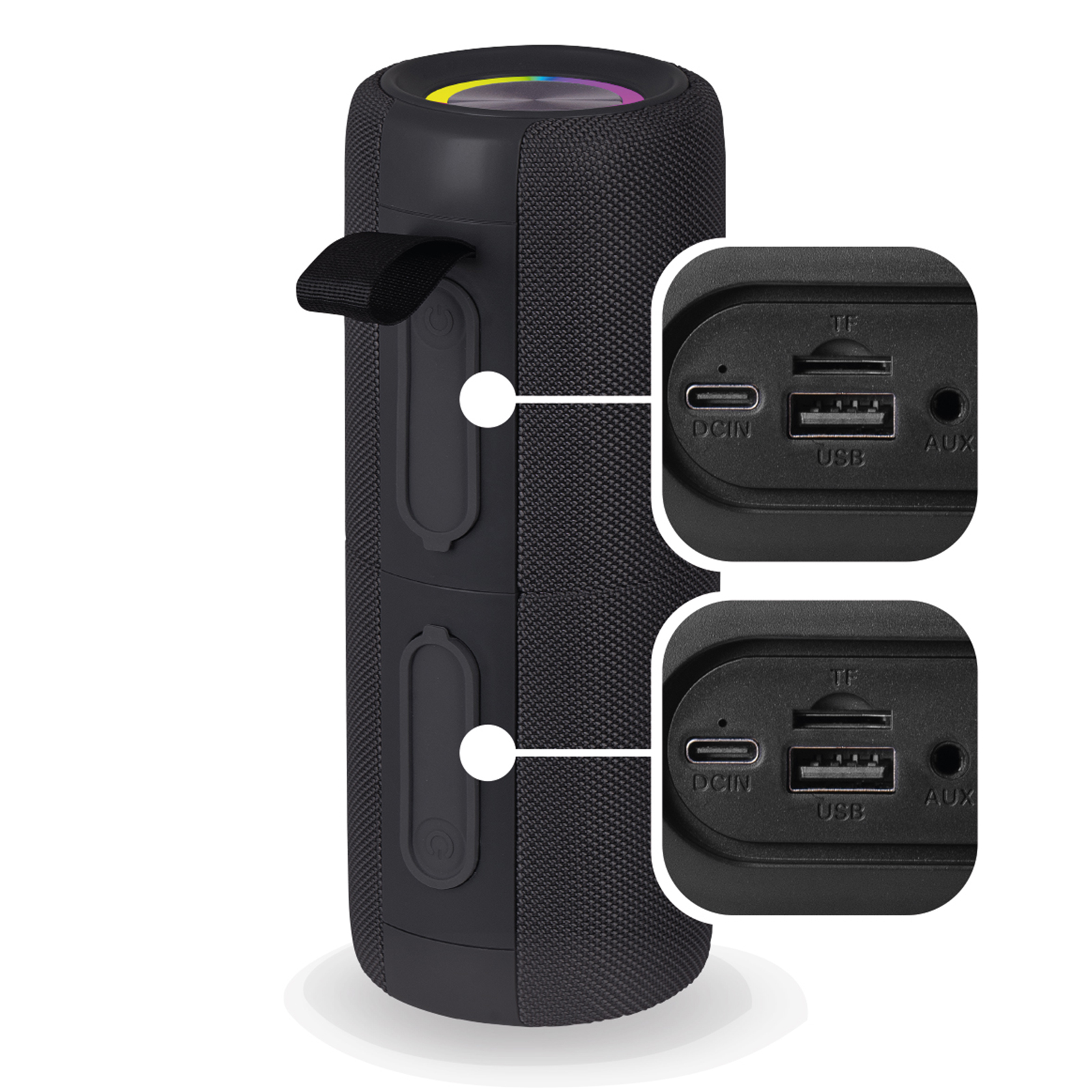 L’ Altoparlante 2x15W Wireless 5.3 Micro SD AUX-IN IPX5 Trevi XCS 8A88 B è alimentato da una Batteria al Litio ad alta capacità, garantendoti ore e ore di musica ininterrotta. La ricarica è facile e veloce tramite USB Type-C, così sarai sempre pronto per la prossima avventura sonora. Progettato per la tua comodità, questo speaker è facile da controllare con tasti dedicati per Volume, Riproduzione e Pausa. Una comoda cinghia per il trasporto lo rende incredibilmente portatile, mentre l'indicatore LED ti tiene sempre aggiornato sullo stato di carica della batteria.