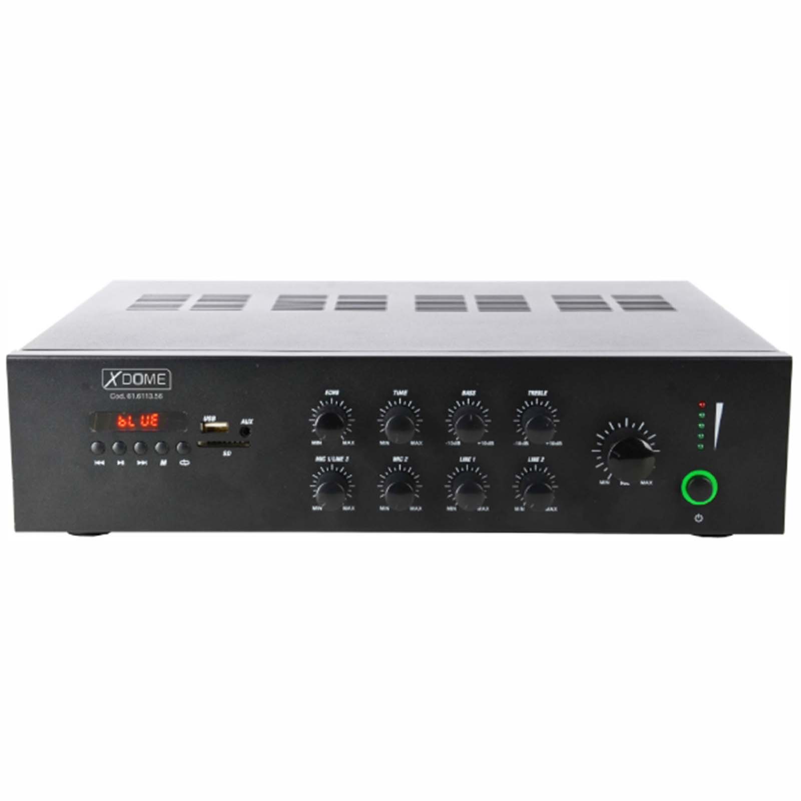 Amplificatore Professionale integrato di potenza per applicazioni Public Address. BLUETOOTH & RADIO FM SCAN. Terminali a vite. Lettore USB / SD. 2 ingressi Mic (6,3mm. + XLR/COMBO 6,3mm.). PHANTOM 48V. 2 ingressi AUX. Uscita AUX. Uscita PA a 70V / 100V. Uscita 4-8 Ohm per la connessione di un sistema di altoparlanti passivo. Funzione "ECHO". Controlli regolazione toni alti e bassi. Doppia alimentazione (230Vca - 24Vcc,5A). Dimensioni (LxAxP): 360 x 85 x 290 mm. Peso 7,5Kg.