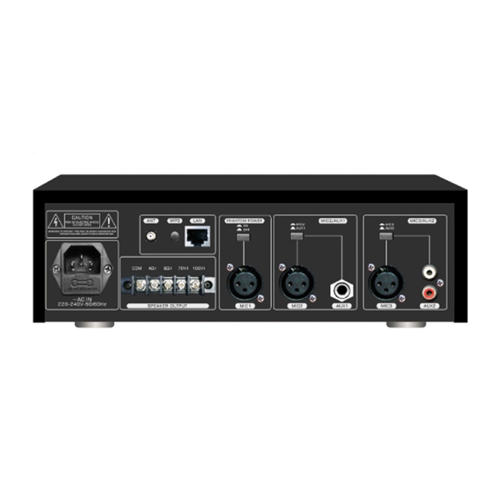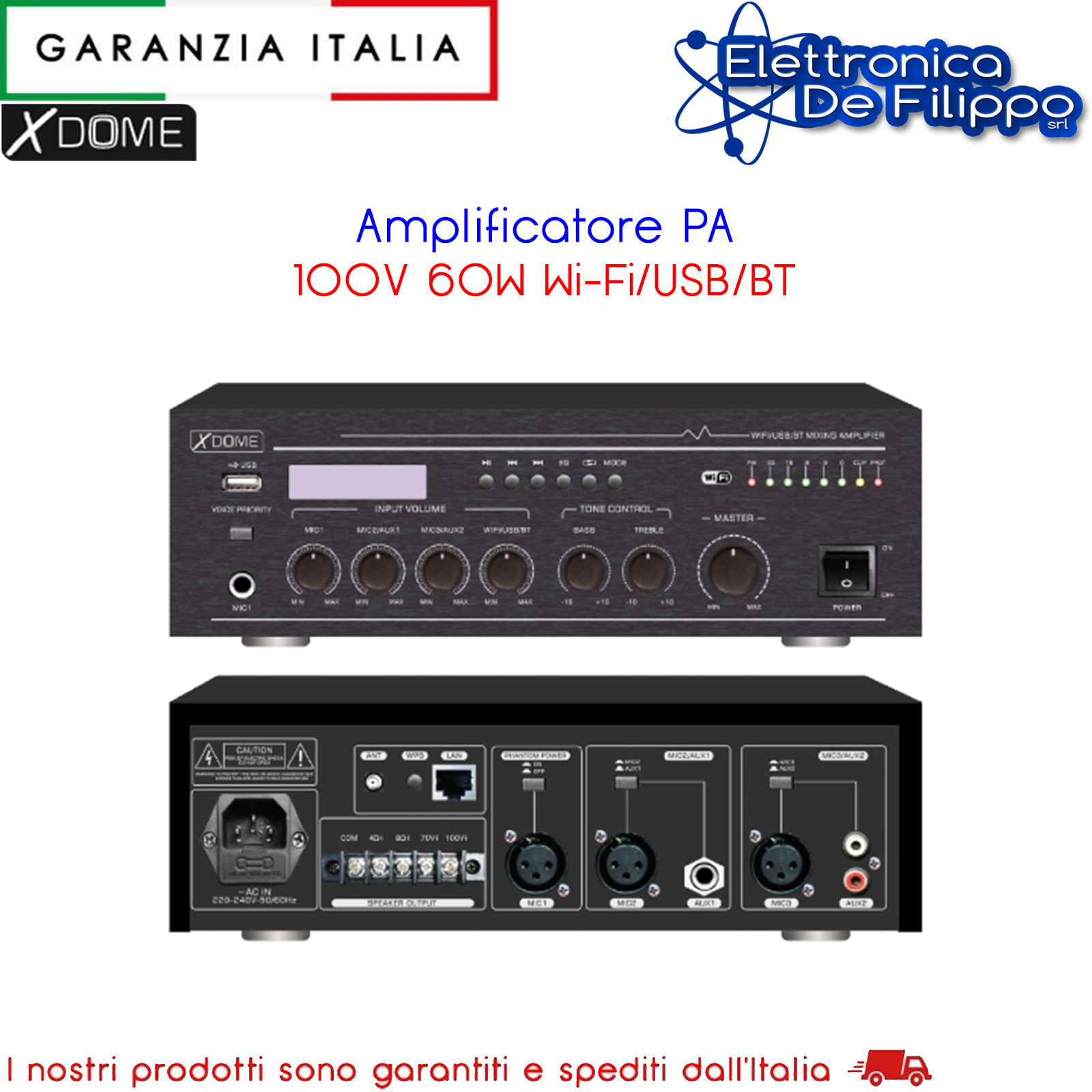 Amplificatore PA da tavolo con potenza di uscita di 60W. Provvisto di 3 ingressi MIC (di cui 2 AUX selezionabili) e una presa LAN per la connessione a internet. L'ingresso MIC 1 è provvisto di presa XLR 3P/6,3 mm con possibilità di alimentazione Phantom +48V. Funzione voice priority per l'assegnazione di priorità all'ingresso MIC 1. Controllo individuale del livello per gli ingressi MIC e AUX. L'amplificatore è provvisto di controllo toni alti e bassi separati + volume master. È presente anche un VU-Meter a 5 led per indicare il livello di uscita. Possono essere collegati sia diffusori a bassa impedenza (4~16Ω) che a tensione costante (70V/100V). Connessione a un router/access point tramite Wi-Fi (o rete LAN cablata in caso di segnale problematico) per lo streaming musicale. Funzione Bluetooth per la connessione diretta di Smartphone utilizzati come riproduttori musicali. Lettore USB per memoria di massa esterna (pendrive, HDD, etc.). Questi amplificatori sono provvisti di protezione contro cortocircuiti e sovratemperatura.