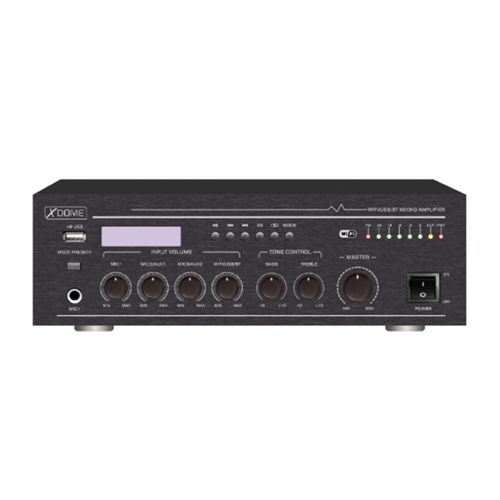 Amplificatore PA da tavolo con potenza di uscita di 60W. Provvisto di 3 ingressi MIC (di cui 2 AUX selezionabili) e una presa LAN per la connessione a internet. L'ingresso MIC 1 è provvisto di presa XLR 3P/6,3 mm con possibilità di alimentazione Phantom +48V. Funzione voice priority per l'assegnazione di priorità all'ingresso MIC 1. Controllo individuale del livello per gli ingressi MIC e AUX. L'amplificatore è provvisto di controllo toni alti e bassi separati + volume master. È presente anche un VU-Meter a 5 led per indicare il livello di uscita. Possono essere collegati sia diffusori a bassa impedenza (4~16Ω) che a tensione costante (70V/100V). Connessione a un router/access point tramite Wi-Fi (o rete LAN cablata in caso di segnale problematico) per lo streaming musicale. Funzione Bluetooth per la connessione diretta di Smartphone utilizzati come riproduttori musicali. Lettore USB per memoria di massa esterna (pendrive, HDD, etc.). Questi amplificatori sono provvisti di protezione contro cortocircuiti e sovratemperatura.