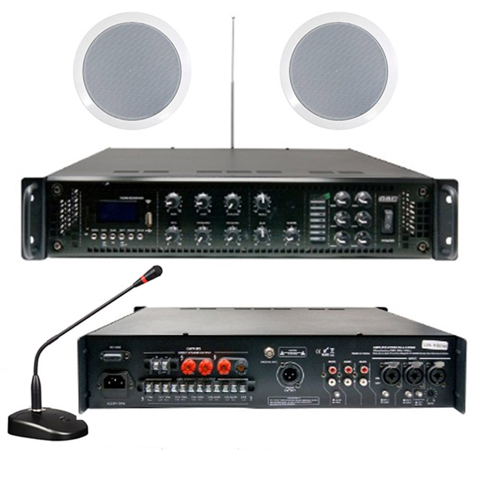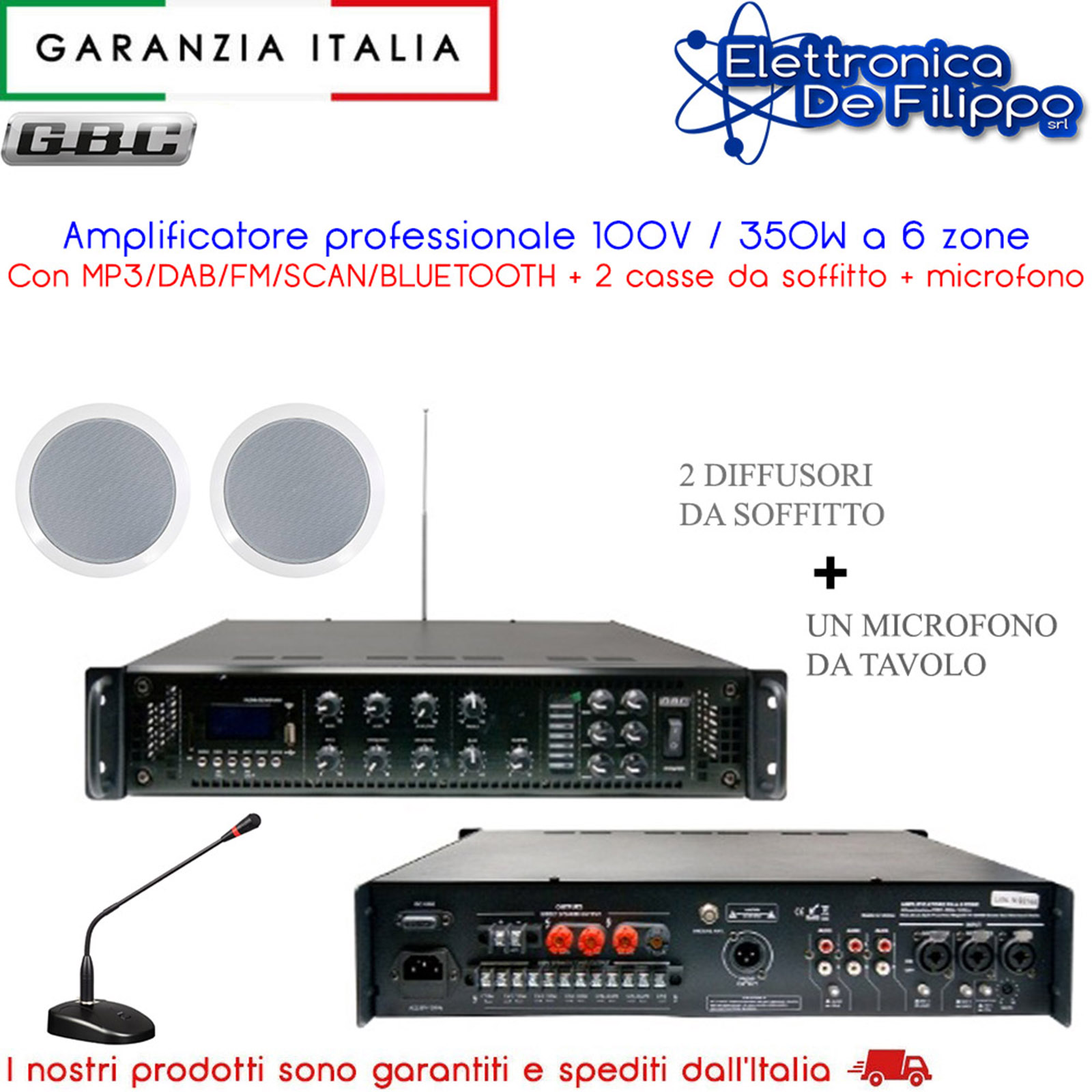 Amplificatore 100V/350W a 6 zone MP3/DAB/FM/SCAN/BT con 2 casse e con microfono