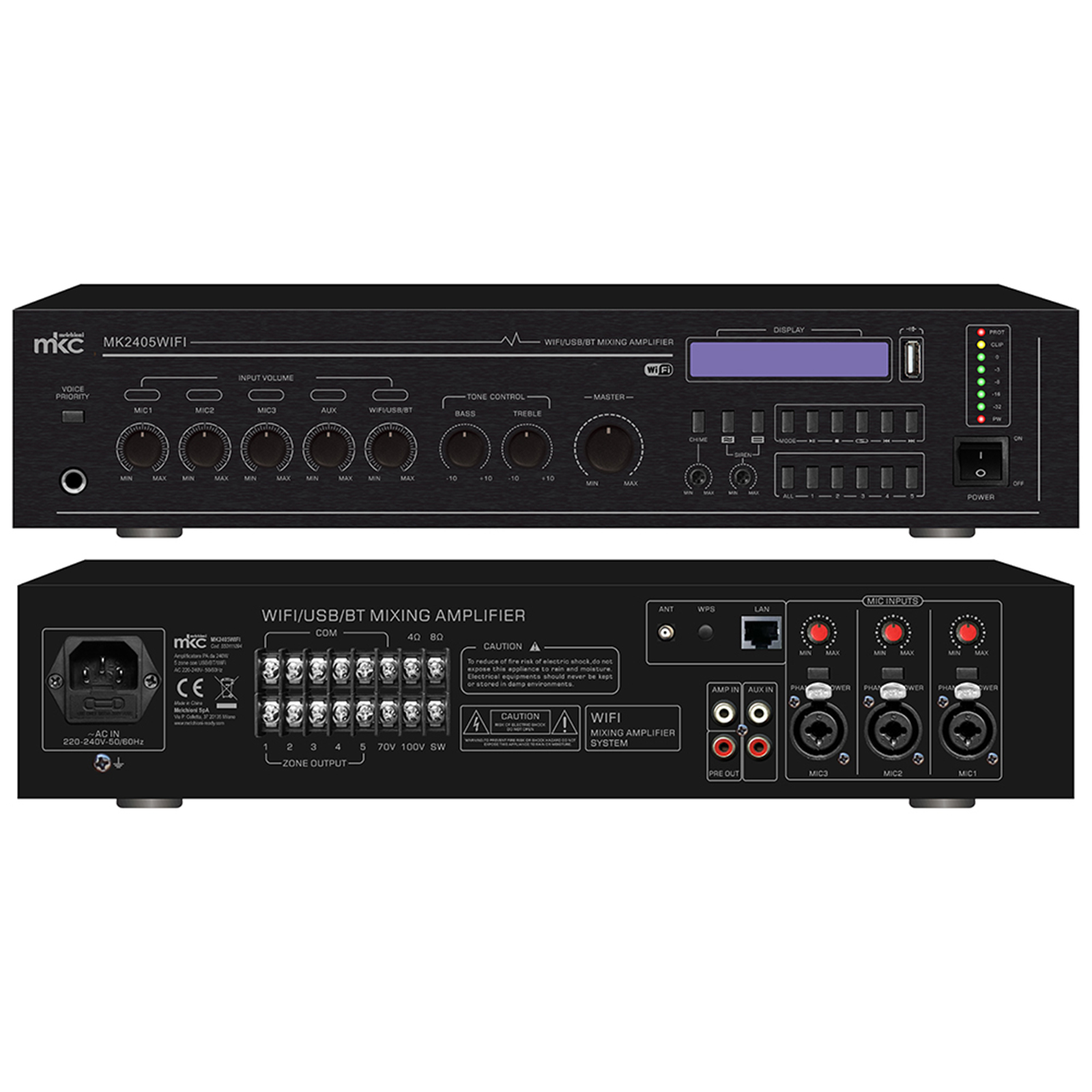 Amplificatore Audio PA 5 zone ad alte prestazioni, adatto per la trasmissione di musica di sottofondo in scuole, uffici, fabbriche, negozi e edifici commerciali. Potenza nominale di 350W 120W e controllo indipendente ON/OFF/ Volume, per le 5 zone. Dotato di uscite diffusori 100V / 4-8Ω, funzioni MEDIA: USB/mp3/WAV player, ricevitore Bluetooth e funzione WI-FI per lo streaming audio di emittenti Radio da tutto il mondo tramite controllo da APP dedicata. 4 ingressi MIC (su 3 con alimentazione Phantom inseribile) e 1 ingresso AUX e 1 ingresso e 1 uscita PRE. Regolazione dei bassi e degli acuti. Ogni ingresso AUX/MIC/WI-FI, sono dotati di controllo del volume individuale. Un Display digitale visualizza lo stato di funzionamento del programma di riproduzione, che può essere controllato dai pulsanti del pannello frontale. Le funzioni CHIME e SIRENA sono integrate con controllo individuale sul pannello frontale.