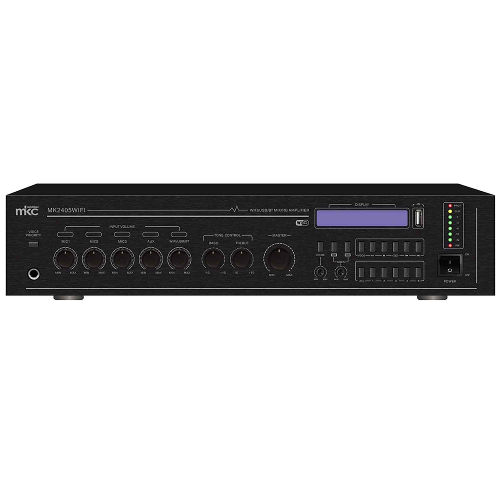 Amplificatore Audio PA 5 zone ad alte prestazioni, adatto per la trasmissione di musica di sottofondo in scuole, uffici, fabbriche, negozi e edifici commerciali. Potenza nominale di 350W 120W e controllo indipendente ON/OFF/ Volume, per le 5 zone. Dotato di uscite diffusori 100V / 4-8Ω, funzioni MEDIA: USB/mp3/WAV player, ricevitore Bluetooth e funzione WI-FI per lo streaming audio di emittenti Radio da tutto il mondo tramite controllo da APP dedicata. 4 ingressi MIC (su 3 con alimentazione Phantom inseribile) e 1 ingresso AUX e 1 ingresso e 1 uscita PRE. Regolazione dei bassi e degli acuti. Ogni ingresso AUX/MIC/WI-FI, sono dotati di controllo del volume individuale. Un Display digitale visualizza lo stato di funzionamento del programma di riproduzione, che può essere controllato dai pulsanti del pannello frontale. Le funzioni CHIME e SIRENA sono integrate con controllo individuale sul pannello frontale.
