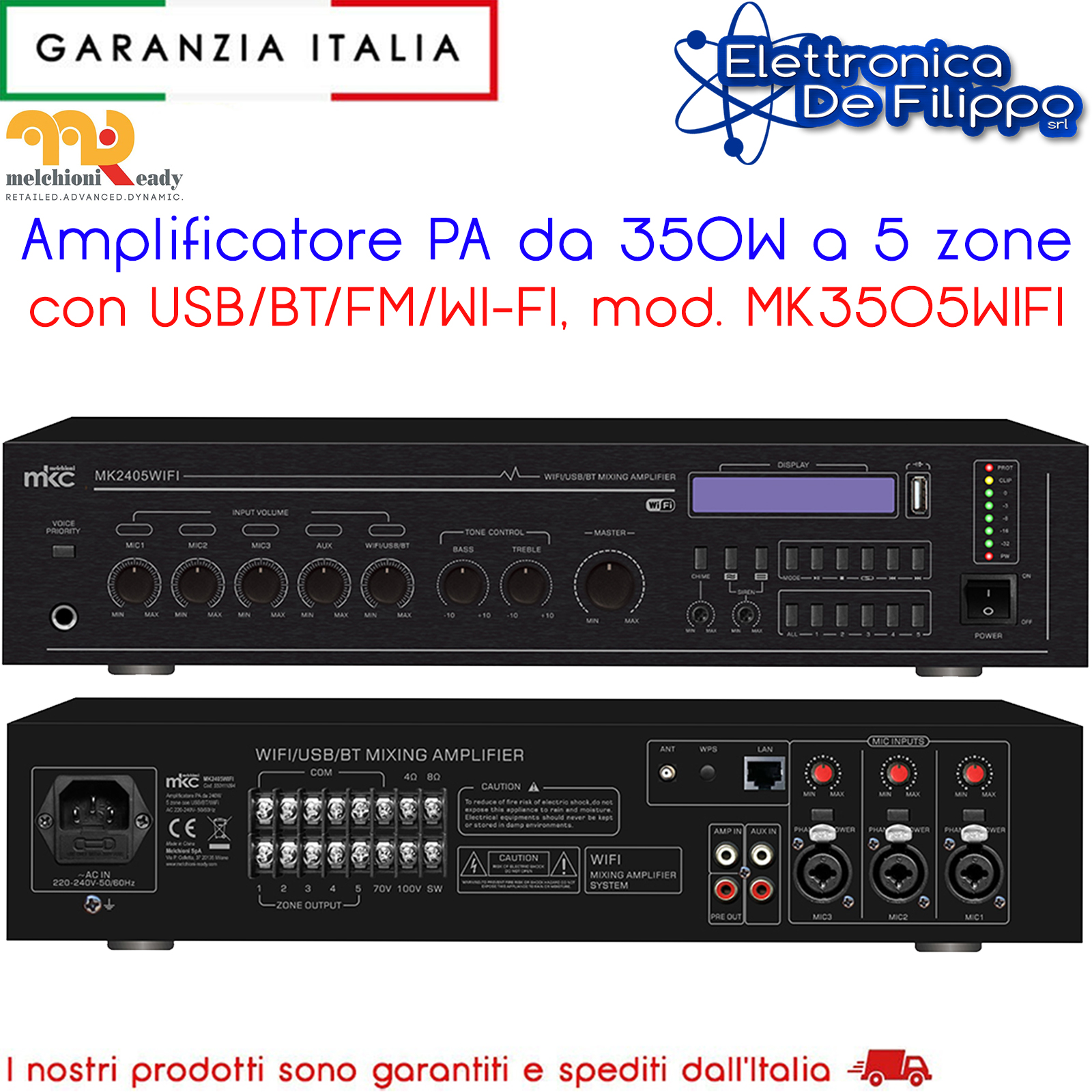 Amplificatore Audio PA 5 zone ad alte prestazioni, adatto per la trasmissione di musica di sottofondo in scuole, uffici, fabbriche, negozi e edifici commerciali. Potenza nominale di 350W 120W e controllo indipendente ON/OFF/ Volume, per le 5 zone. Dotato di uscite diffusori 100V / 4-8Ω, funzioni MEDIA: USB/mp3/WAV player, ricevitore Bluetooth e funzione WI-FI per lo streaming audio di emittenti Radio da tutto il mondo tramite controllo da APP dedicata. 4 ingressi MIC (su 3 con alimentazione Phantom inseribile) e 1 ingresso AUX e 1 ingresso e 1 uscita PRE. Regolazione dei bassi e degli acuti. Ogni ingresso AUX/MIC/WI-FI, sono dotati di controllo del volume individuale. Un Display digitale visualizza lo stato di funzionamento del programma di riproduzione, che può essere controllato dai pulsanti del pannello frontale. Le funzioni CHIME e SIRENA sono integrate con controllo individuale sul pannello frontale.