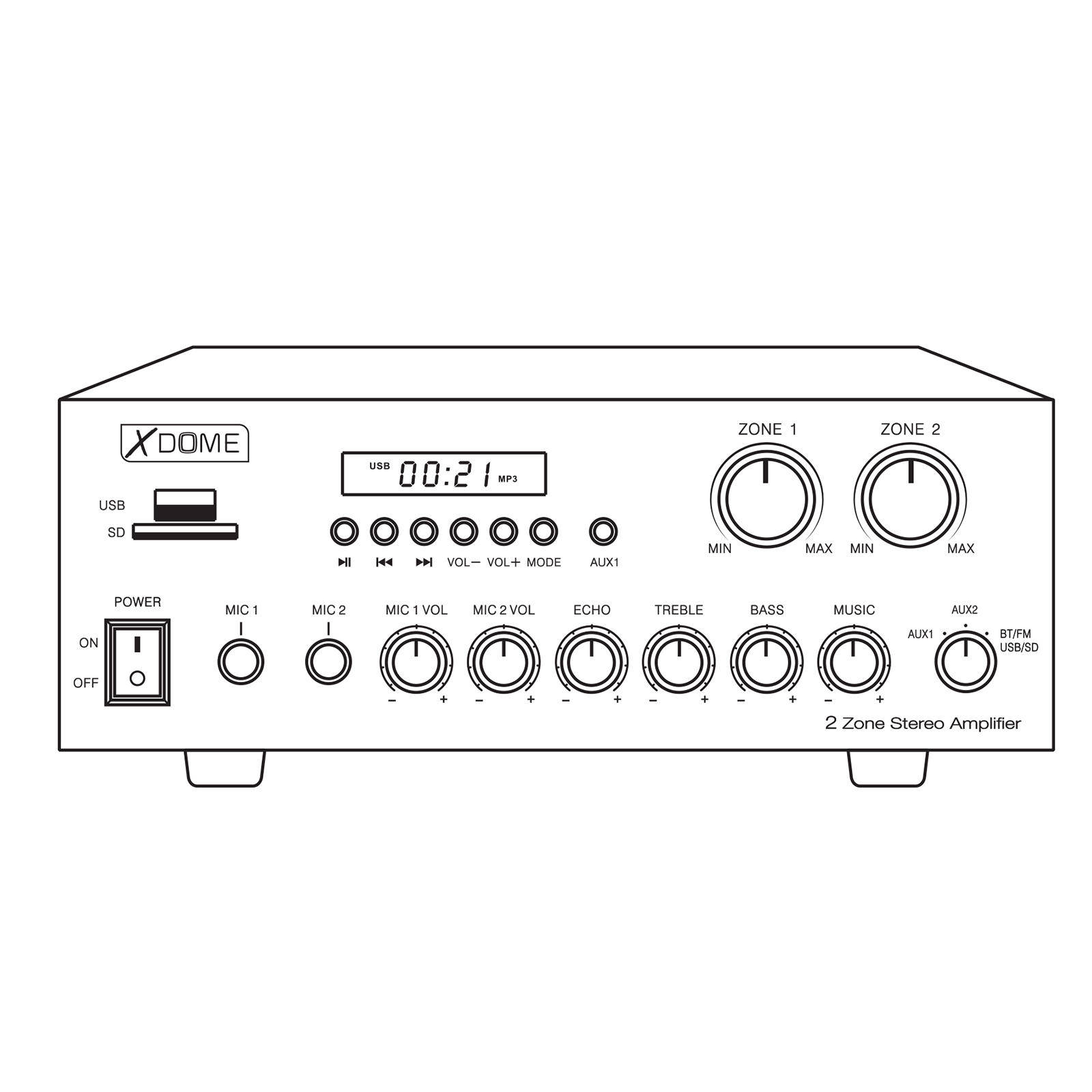 Amplificatore PA con Bluetooth per lo streaming musicale, radio FM integrata e slot per MP3 / SD. Finale audio 2 x 100W (max) a 8 Ohm, 2 canali d'uscita, equalizzatore e telecomando. Scocca in metallo.> ?SPECIFICHE TECNICHE