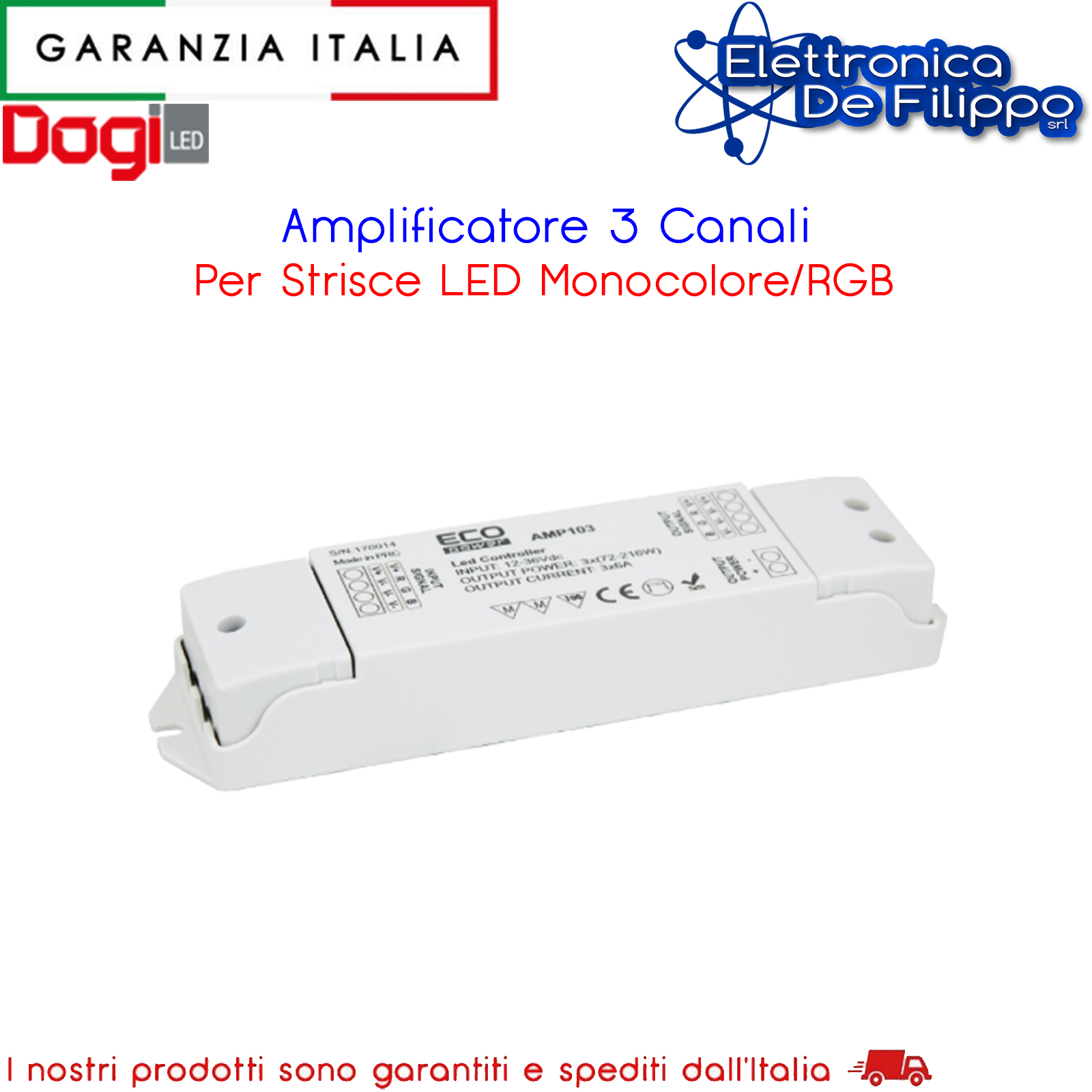 Permette il collegamento multiplo di strip LED monocolore o RGB, dotato di ripetitore di segnale RGB e morsettiera fissa; possibilità di fissaggio a parete.