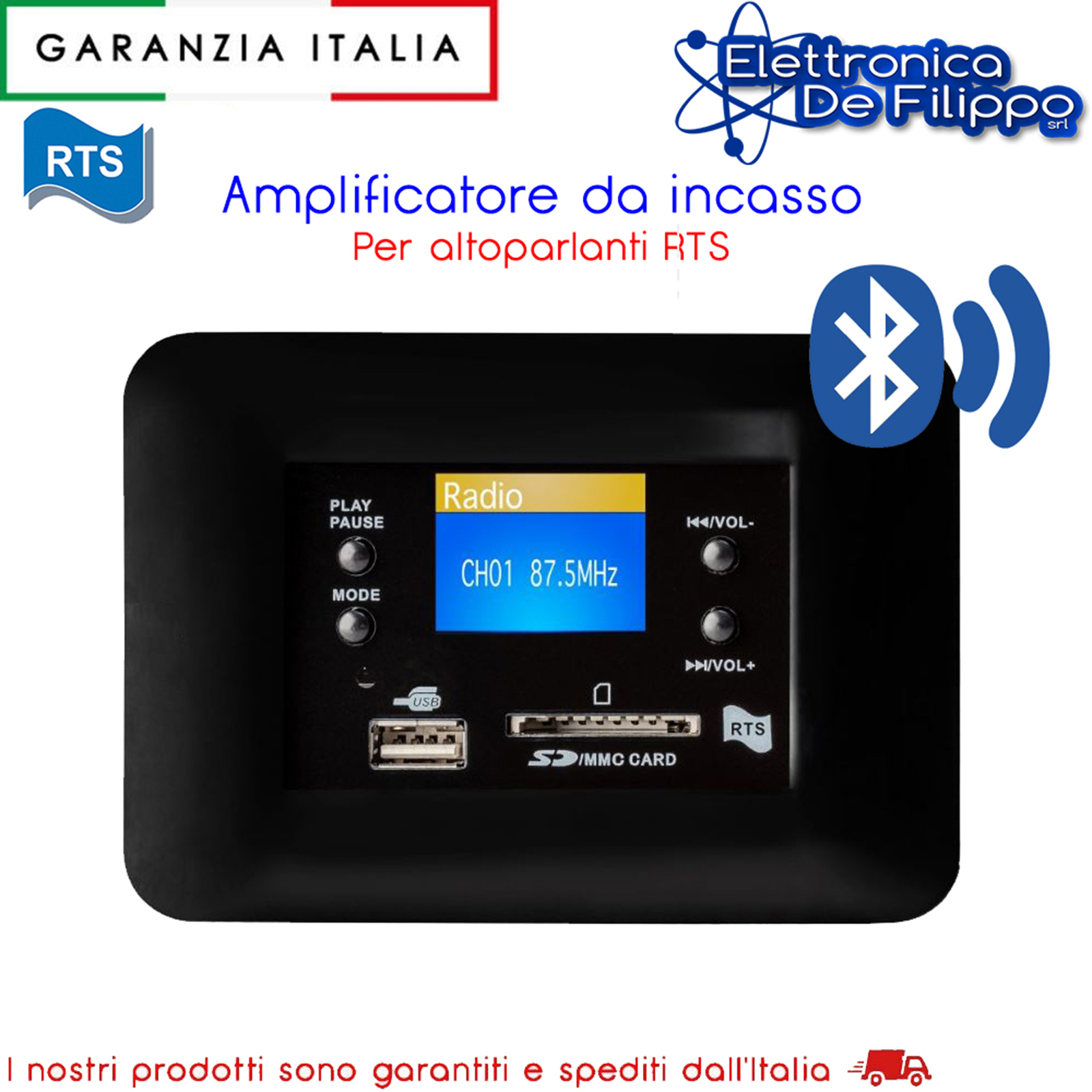 Centrale di diffusione sonora 20 watt mono con Radio Fm, lettore Mp3 per USB e SDHC, Bluetooth 5.0, Aux input (Line In) e display Lcd lirico. Ideata per non occupare spazio con l’incasso in scatola 503, progettata per amplificare il suono in ogni ambiente e avere un volume indipendente. La centrale consente la riproduzione musicale anche da smartphone e può essere comandata con i tasti frontali, in controllo remoto, con il telecomando infrarosso o con comandi vocali attraverso Amazon Alexa