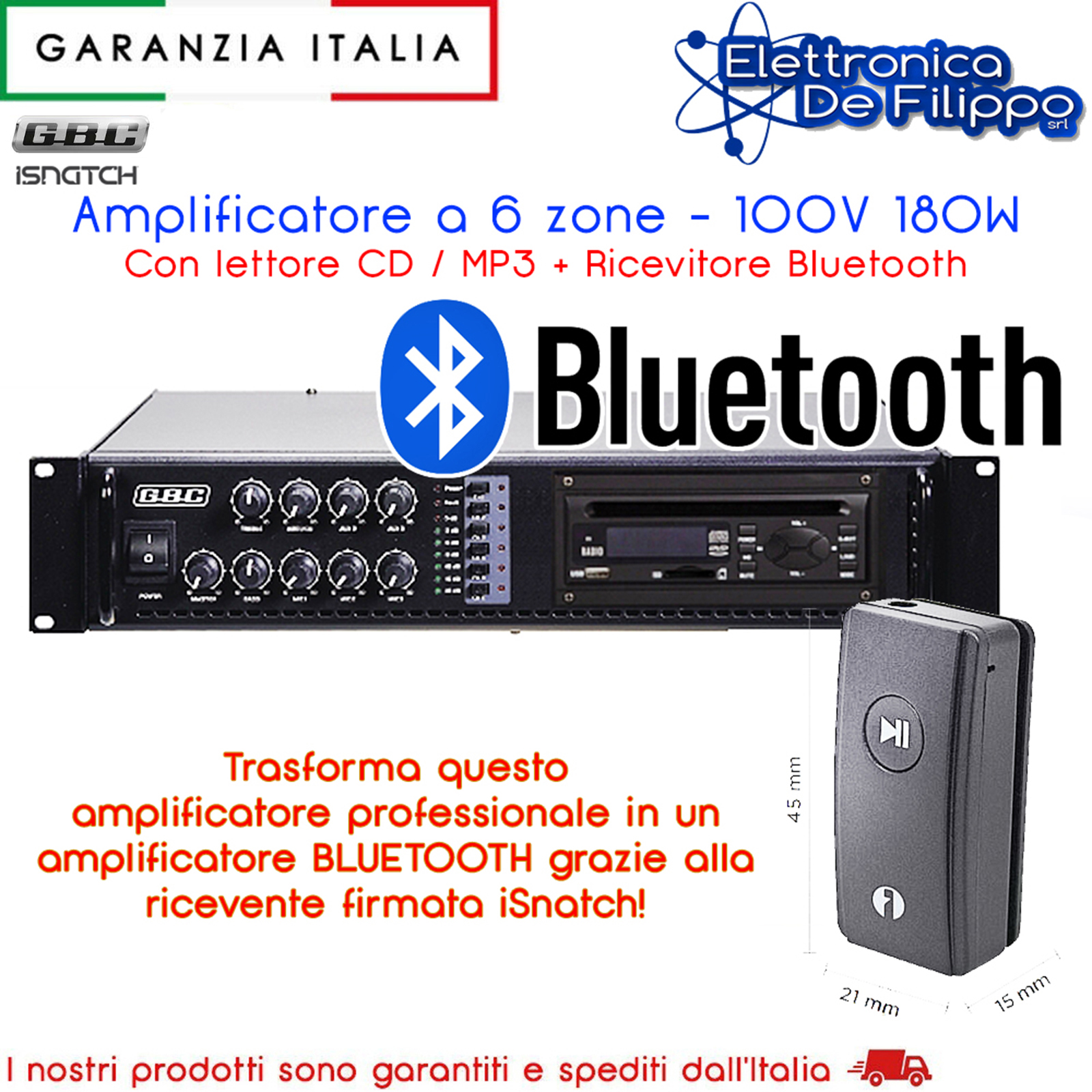 Sinto-amplificatore integrato di potenza, adatto per le applicazioni Public Address più diversificate e impegnative. Terminali a vite per output 6 zone. Raffreddamento a ventola. Sintonizzatore AM/FM. Lettore CD. Lettore MP3. 3 ingressi Mic e 3 ingressi Aux. 1 output Line. Uscita PA a 70V / 100V. Uscita 4-16 Ohm per la connessione di un sistema di altoparlanti passivo per il monitor, potenza di output massima inferiore a un terzo della potenza nominale. Connessione Mic con funzione di priorità. Dimensioni (LxAxP): 480 x 100 x 333 mm