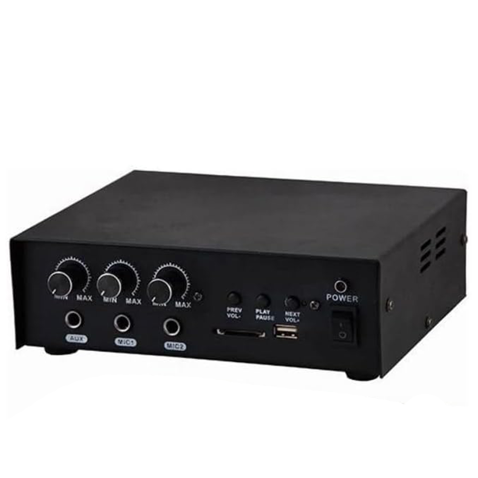 Amplificatore dalle ridotte dimensioni per un comodo utilizzo e installazione su un’autovettura. Può essere alimentato a 230Vca oppure a 12Vcc, tramite la batteria dell’automezzo. Terminali a innesto. Lettore USB / SD. 2 ingressi Mic 6,3mm. Ingresso AUX. Uscita 4-16 Ohm per la connessione di un sistema di altoparlanti passivo. Dimensioni (LxAxP): 205 x 65 x 200 mm. Corredato di un diffusore a tromba da 25W/8Ω e di microfono dinamico 600 ohm.
