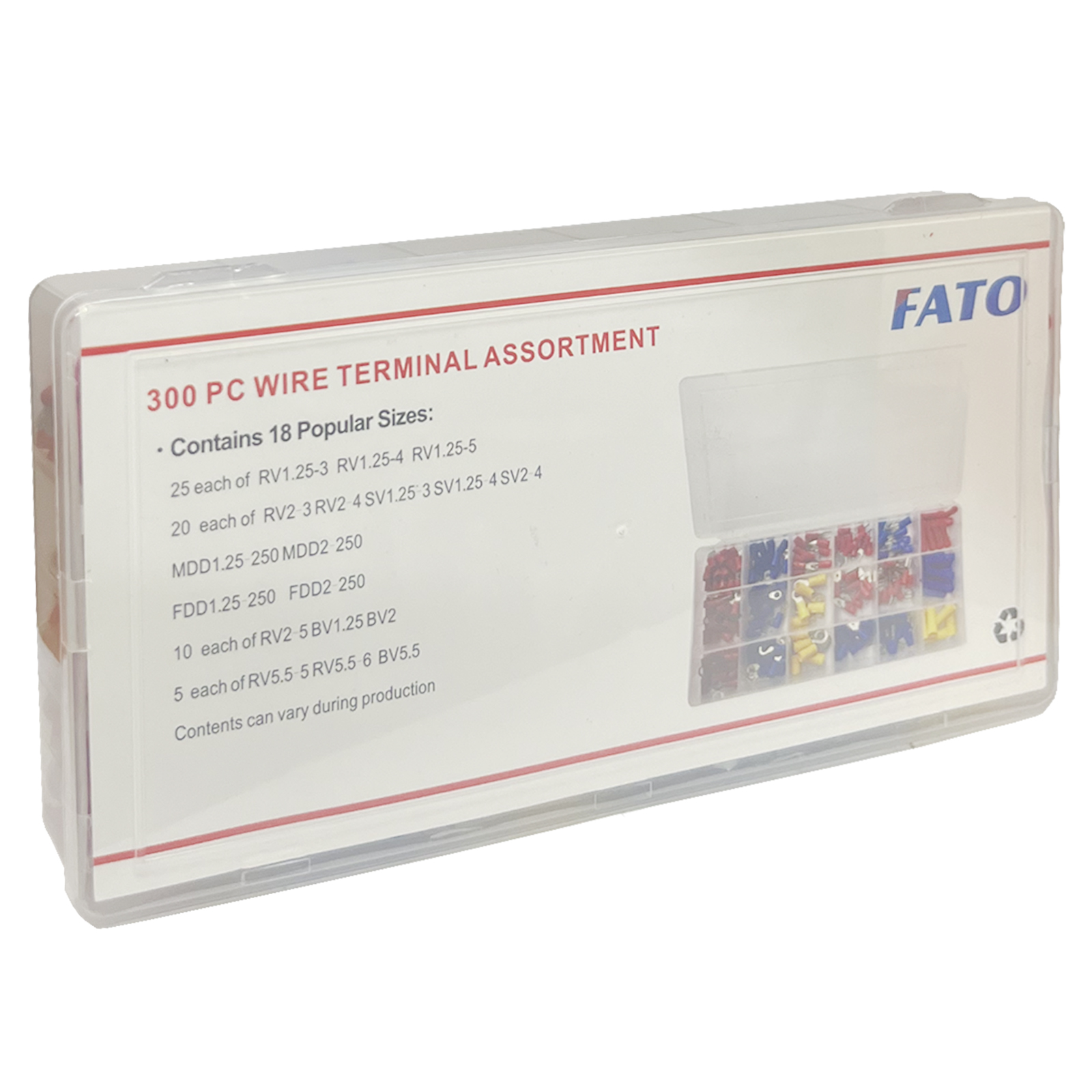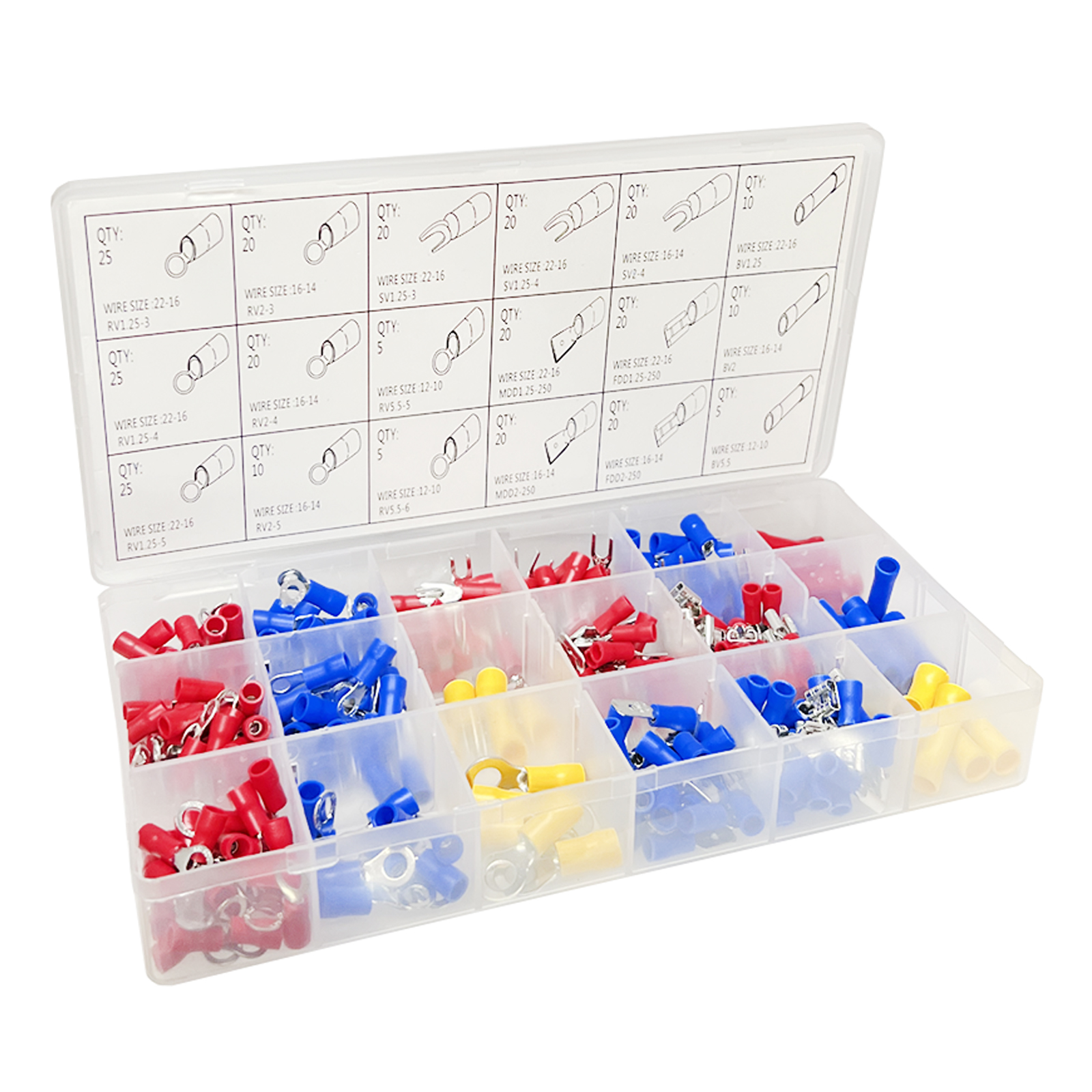 Assortimento di 300 capicorda preisolati in 18 diversi formati, piatti maschio, piatti femmina, a forchetta, a pressione ed altri.