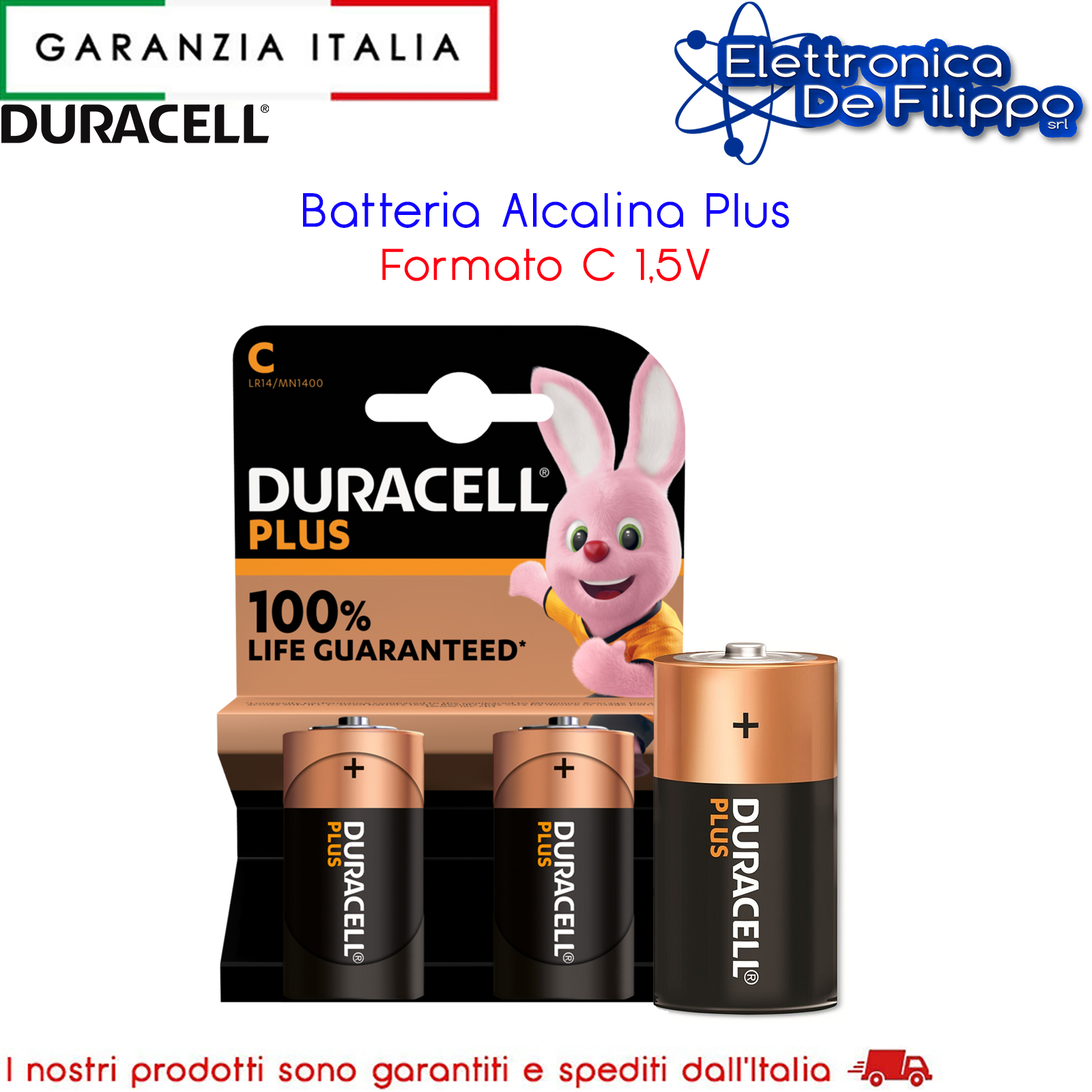 Duracell offre un'ampia gamma di batterie da usare in dispositivi elettronici che richiedono energia affidabile. Le batterie Duracell Plus C sono batterie alcaline ideali per alimentare tutti i tuoi dispositivi e offrono il 100% di energia garantita (garanzia commerciale rispetto alla durata minima media nei test 2015 IEC sulle batterie di formato C; i risultati possono variare a seconda del dispositivo e del tipo di utilizzo (sito web IEC). Le batterie Duracell non utilizzate garantiscono una durata fino a 10 anni, se correttamente conservate nella confezione. Nel 1969 Duracell partecipa alla missione Apollo 11 e diventa la prima batteria ad andare sulla luna.