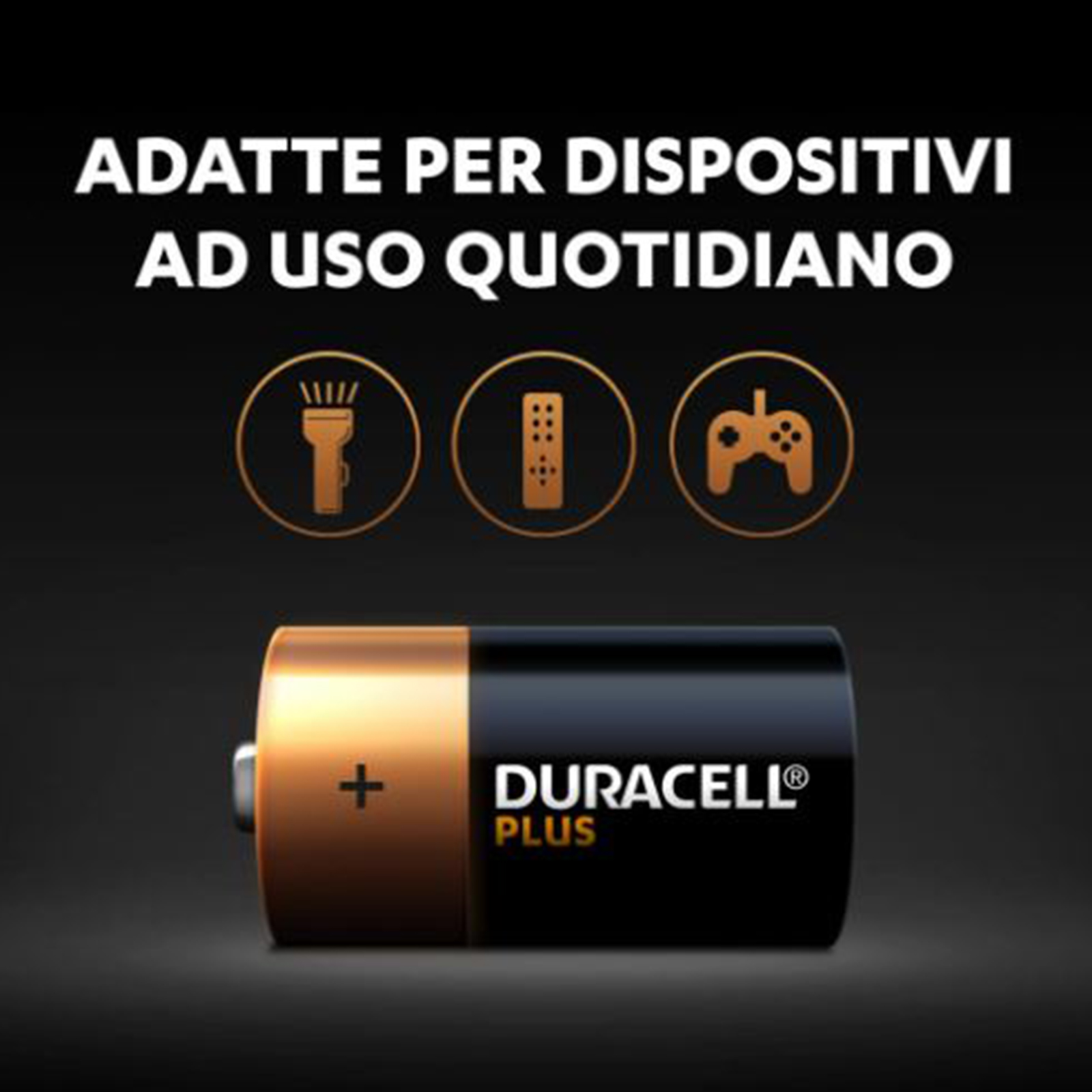Duracell offre un'ampia gamma di batterie da usare in dispositivi elettronici che richiedono energia affidabile. Le batterie Duracell Plus C sono batterie alcaline ideali per alimentare tutti i tuoi dispositivi e offrono il 100% di energia garantita (garanzia commerciale rispetto alla durata minima media nei test 2015 IEC sulle batterie di formato C; i risultati possono variare a seconda del dispositivo e del tipo di utilizzo (sito web IEC). Le batterie Duracell non utilizzate garantiscono una durata fino a 10 anni, se correttamente conservate nella confezione. Nel 1969 Duracell partecipa alla missione Apollo 11 e diventa la prima batteria ad andare sulla luna.