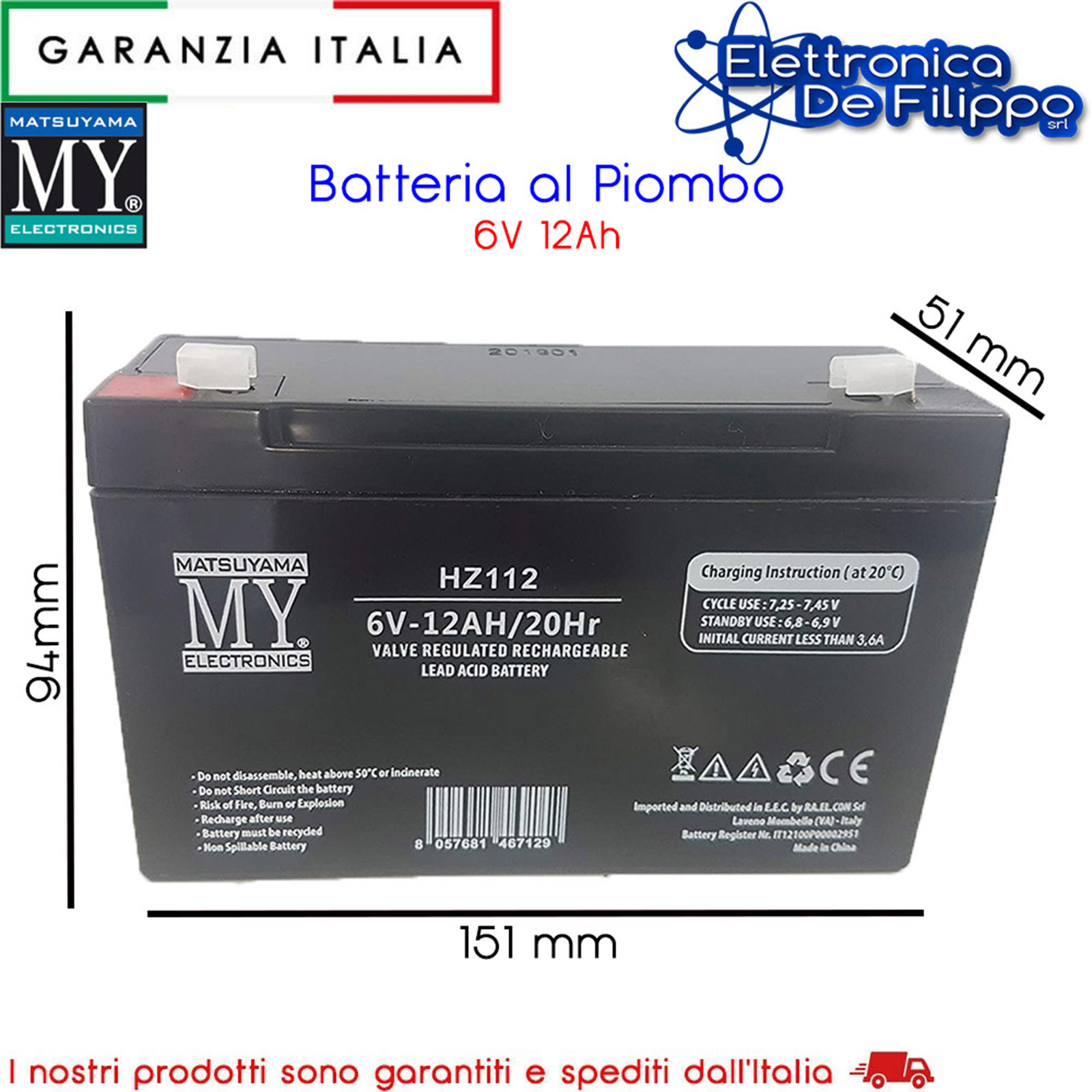 Batteria al Piombo AGM con celle alta qualità, uscita da 6V DC corrente continua con potenza di 12AH Ampere (12000mA).