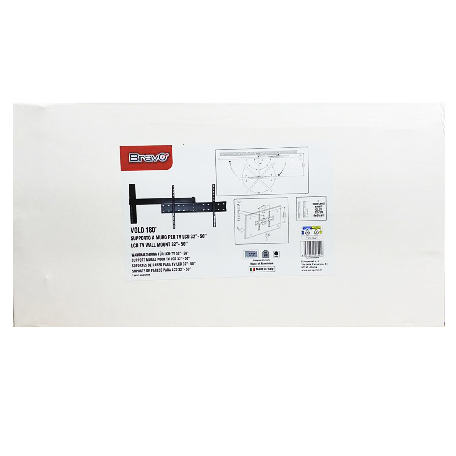 Supporto a muro per TV 32”-50” Attacchi da 20x10 a 60x40 max Dotato di due coppie di staffe (lunghe e corte) per consentire un più agevole montaggio dei TV OLED Rotazione 180° Vite blocca TV Completo di kit viti per il fissaggio TV Livella incorporata per un migliore posizionamento del supporto a muro Carico massimo 30 Kg Colore nero