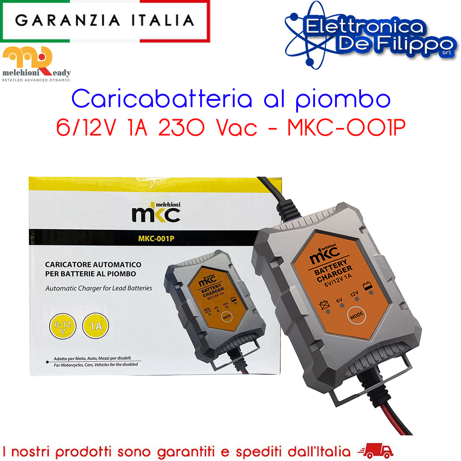 Caricabatterie per batterie al piombo da 6/12V con una capacità di 1A, che funziona a 230V AC. Questo tipo di caricabatterie è comunemente usato per ricaricare batterie di veicoli, motociclette, imbarcazioni e altri dispositivi che utilizzano batterie al piombo.
