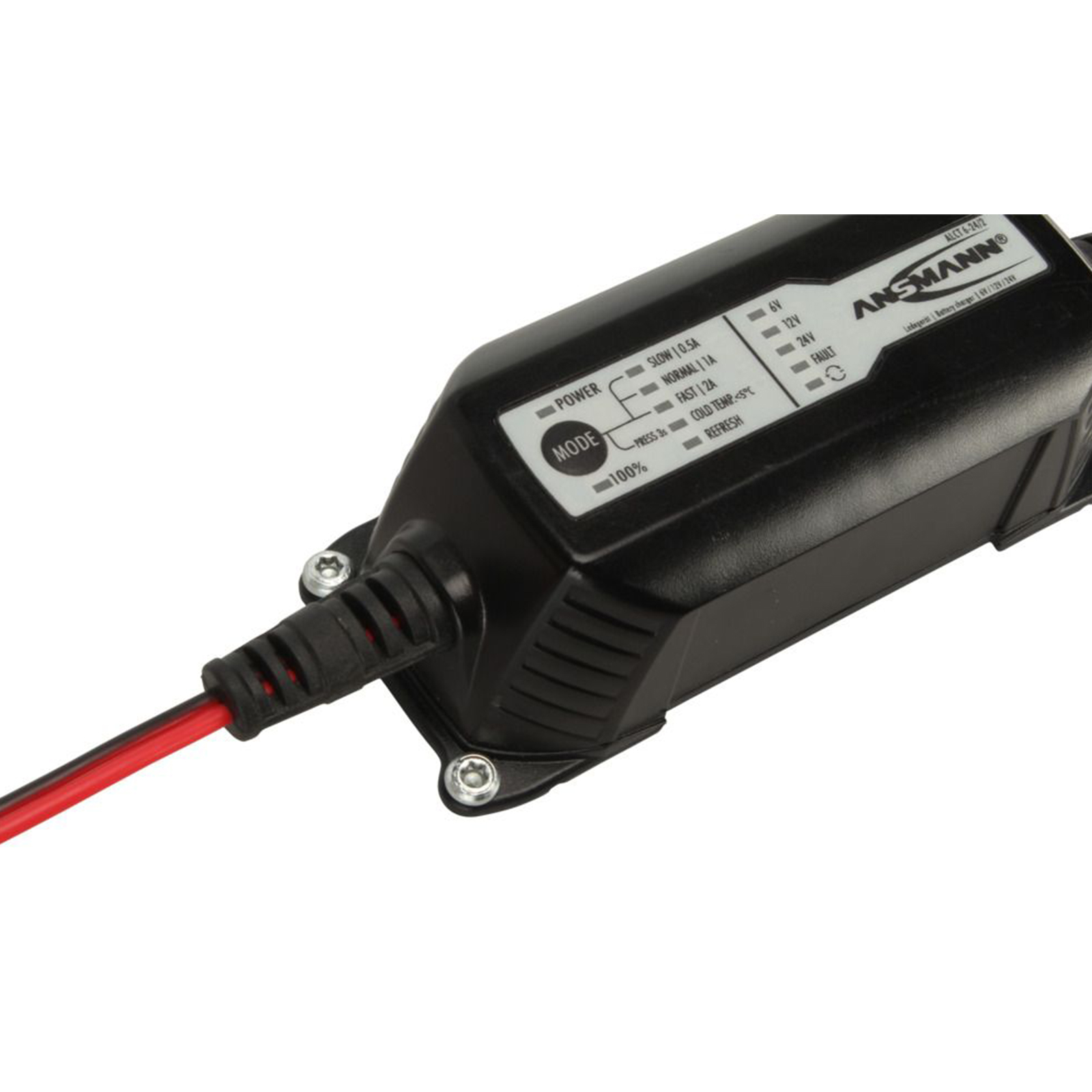 Grazie a numerose caratteristiche, l'ALCT 6-24/2 garantisce una ricarica sicura e delicata e garantisce prestazioni ottimali e una lunga durata delle batterie al piombo. Dopo aver collegato con successo i terminali dei poli, il dispositivo rileva automaticamente la tensione della batteria al piombo collegata e la indica tramite il LED corrispondente sul display. A seconda della tensione, è possibile selezionare una corrente di carica tramite il pulsante "MODE", il che significa che le batterie dell'auto possono essere caricate molto rapidamente, ma anche le piccole batterie della moto possono essere caricate molto delicatamente.