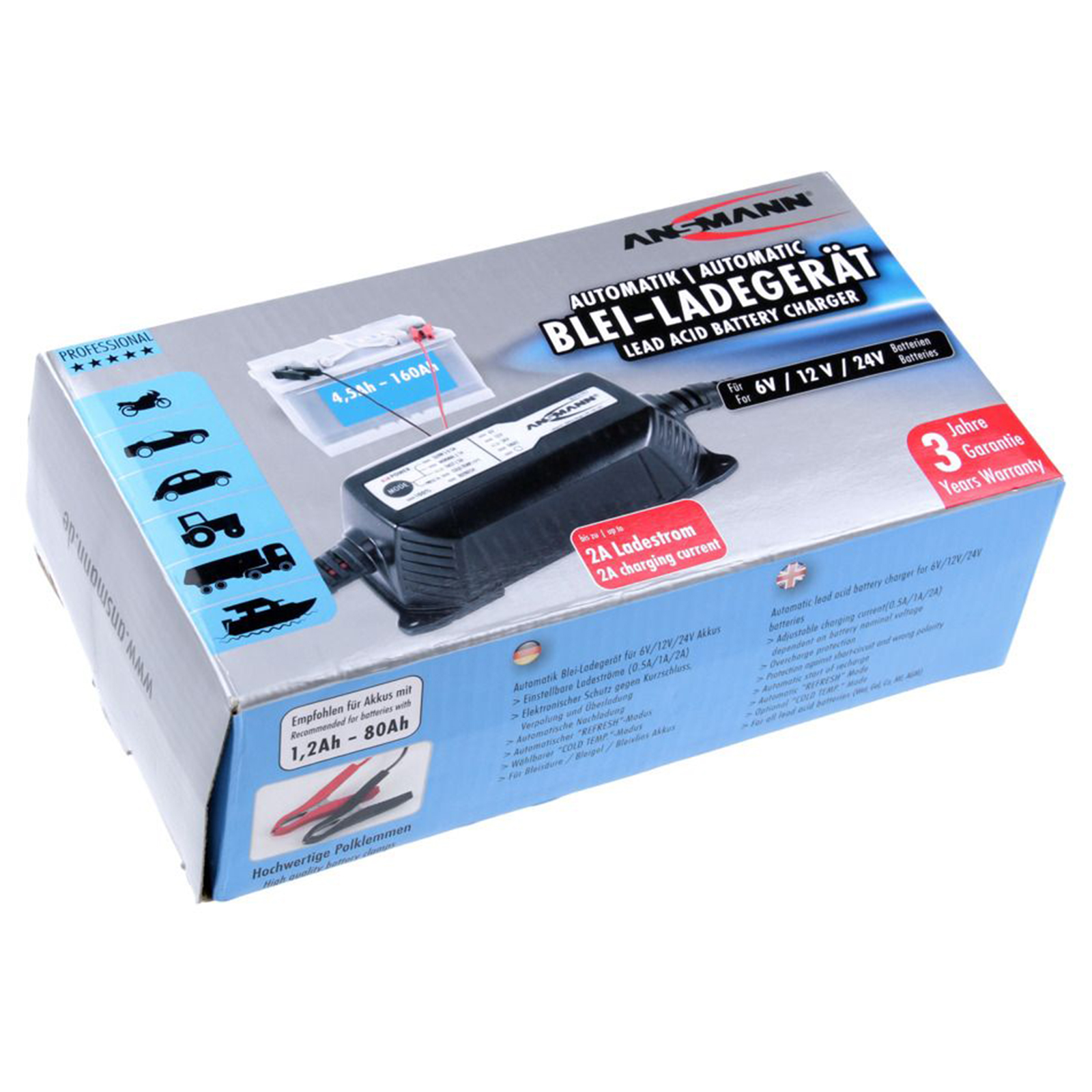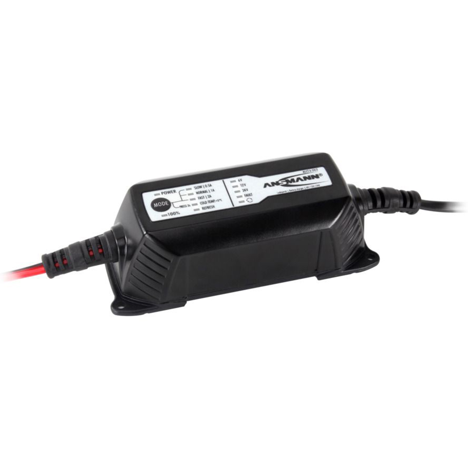 Grazie a numerose caratteristiche, l'ALCT 6-24/2 garantisce una ricarica sicura e delicata e garantisce prestazioni ottimali e una lunga durata delle batterie al piombo. Dopo aver collegato con successo i terminali dei poli, il dispositivo rileva automaticamente la tensione della batteria al piombo collegata e la indica tramite il LED corrispondente sul display. A seconda della tensione, è possibile selezionare una corrente di carica tramite il pulsante "MODE", il che significa che le batterie dell'auto possono essere caricate molto rapidamente, ma anche le piccole batterie della moto possono essere caricate molto delicatamente.
