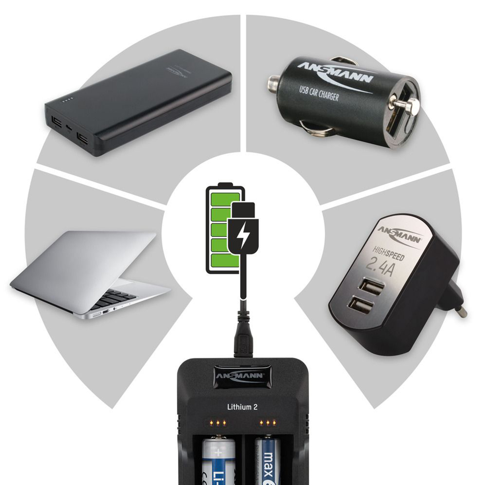 Sono disponibili numerose dimensioni diverse di batterie ricaricabili, in particolare nel segmento agli ioni di litio. Con il caricabatterie Lithium 2 di ANSMANN avete scelto un tuttofare universale con il miglior rapporto qualità-prezzo. Con i due slot di ricarica è possibile caricare 1-2 batterie ricaricabili agli ioni di litio nelle dimensioni 26650, 22650, 18650, 18500, 17670, 16340, 14500 ecc. o 1-2 batterie ricaricabili NiMH AA / AAA, indipendentemente l'una dall'altra. Il dispositivo rileva la batteria inserita in modo completamente automatico e senza noiose regolazioni. Il processo di carica inizia immediatamente, una volta inserite le celle con la polarità corretta.