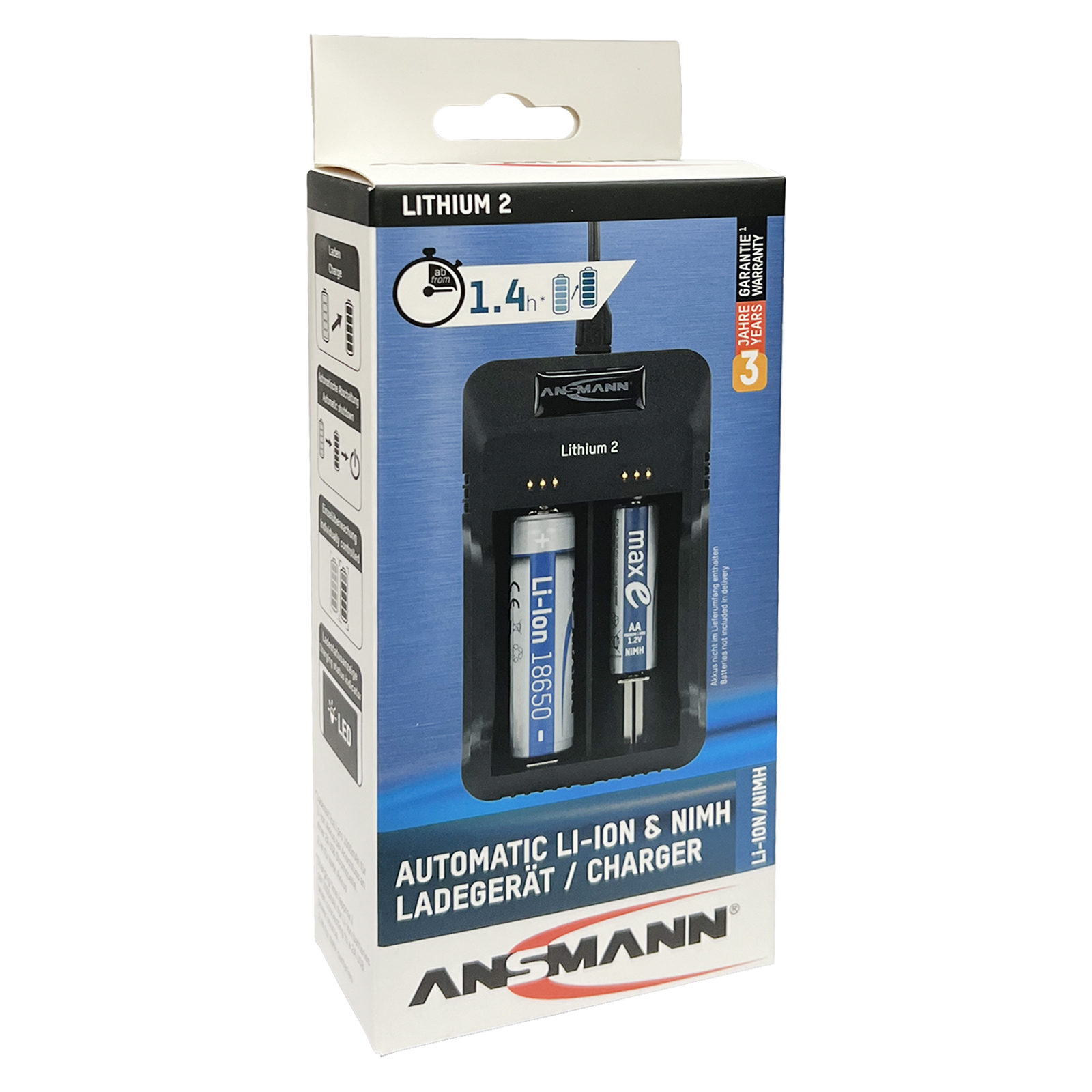 Sono disponibili numerose dimensioni diverse di batterie ricaricabili, in particolare nel segmento agli ioni di litio. Con il caricabatterie Lithium 2 di ANSMANN avete scelto un tuttofare universale con il miglior rapporto qualità-prezzo. Con i due slot di ricarica è possibile caricare 1-2 batterie ricaricabili agli ioni di litio nelle dimensioni 26650, 22650, 18650, 18500, 17670, 16340, 14500 ecc. o 1-2 batterie ricaricabili NiMH AA / AAA, indipendentemente l'una dall'altra. Il dispositivo rileva la batteria inserita in modo completamente automatico e senza noiose regolazioni. Il processo di carica inizia immediatamente, una volta inserite le celle con la polarità corretta.