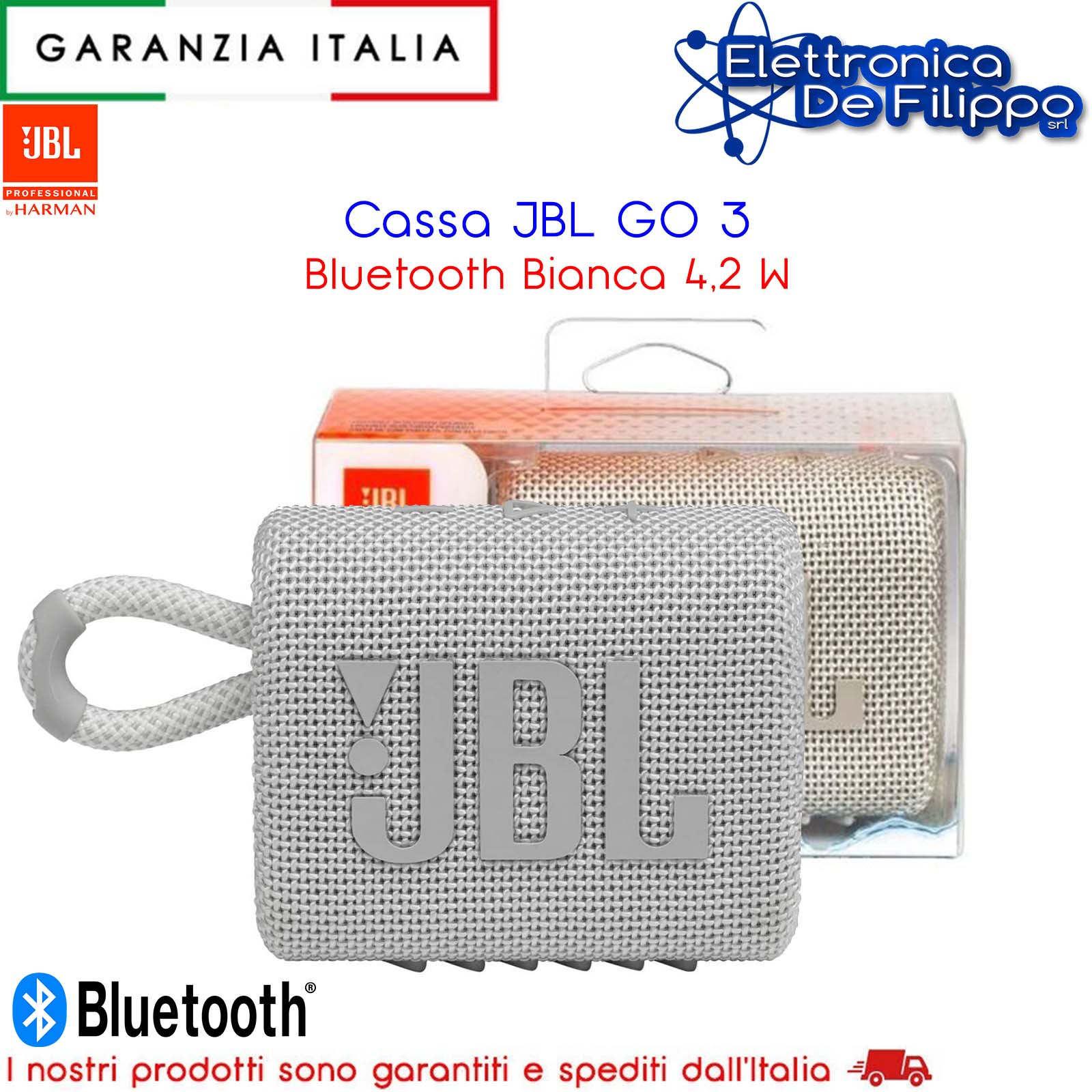 JBL Go 3 è caratterizzato da uno stile grintoso e dall’entusiasmante JBL Pro Sound. Dotato di un design moderno che non passa inosservato, tessuti variopinti e inserti vivaci, è un must di cui non puoi fare a meno. Grazie al JBL Pro Sound, i tuoi brani ti porteranno sul tetto del mondo, mentre il suo design certificato waterproof e dustproof IP67 ti permetterà di goderti la tua musica in qualsiasi condizione meteo e, grazie al suo laccetto integrato, potrai portarlo ovunque. Go 3 è caratterizzato da nuove tonalità e combinazioni cromatiche ispirate allo street style del momento. JBL Go 3 è audace nell’aspetto e nel suono.