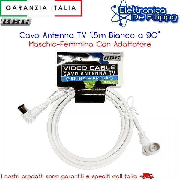 Cavo Antenna TV da Spina 9,5mm 90° a Presa 9,5mm 90° per collegamento dei televisori all'antenna TV. L'adattatore Spina/ Spina incluso, permette un utilizzo universale.