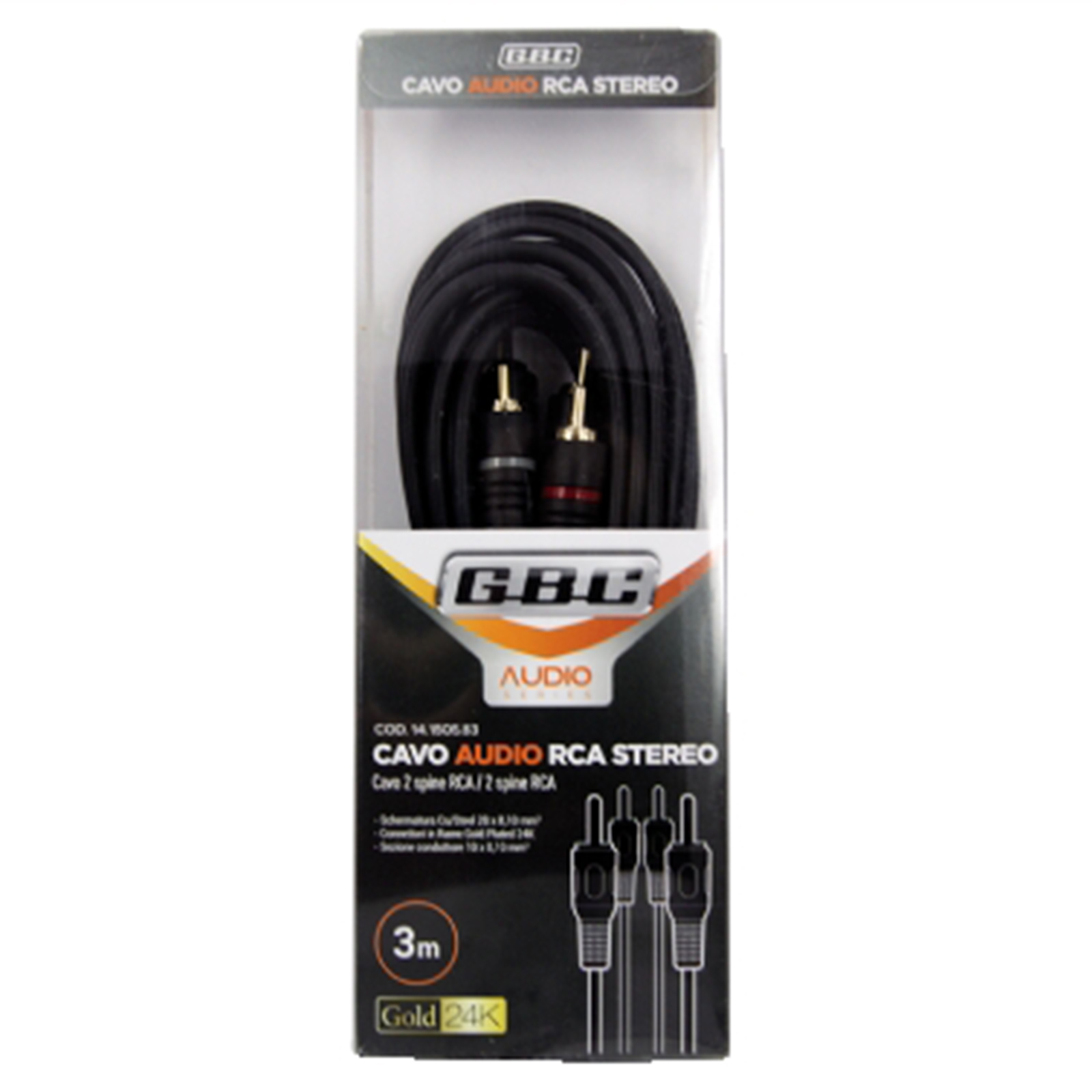 Cavo audio stereo High End RCA per connessioni audio analogiche. Connettori in rame Gold Plated 24K, conduttore in rame, schermatura in rame / alluminio 28 x 0,10mm², sezione conduttore 10 x 0,10mm². Diametro esterno 4mm.