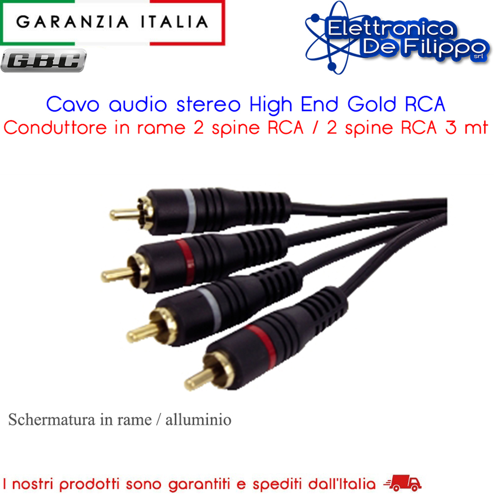 Cavo audio stereo High End RCA per connessioni audio analogiche. Connettori in rame Gold Plated 24K, conduttore in rame, schermatura in rame / alluminio 28 x 0,10mm², sezione conduttore 10 x 0,10mm². Diametro esterno 4mm.