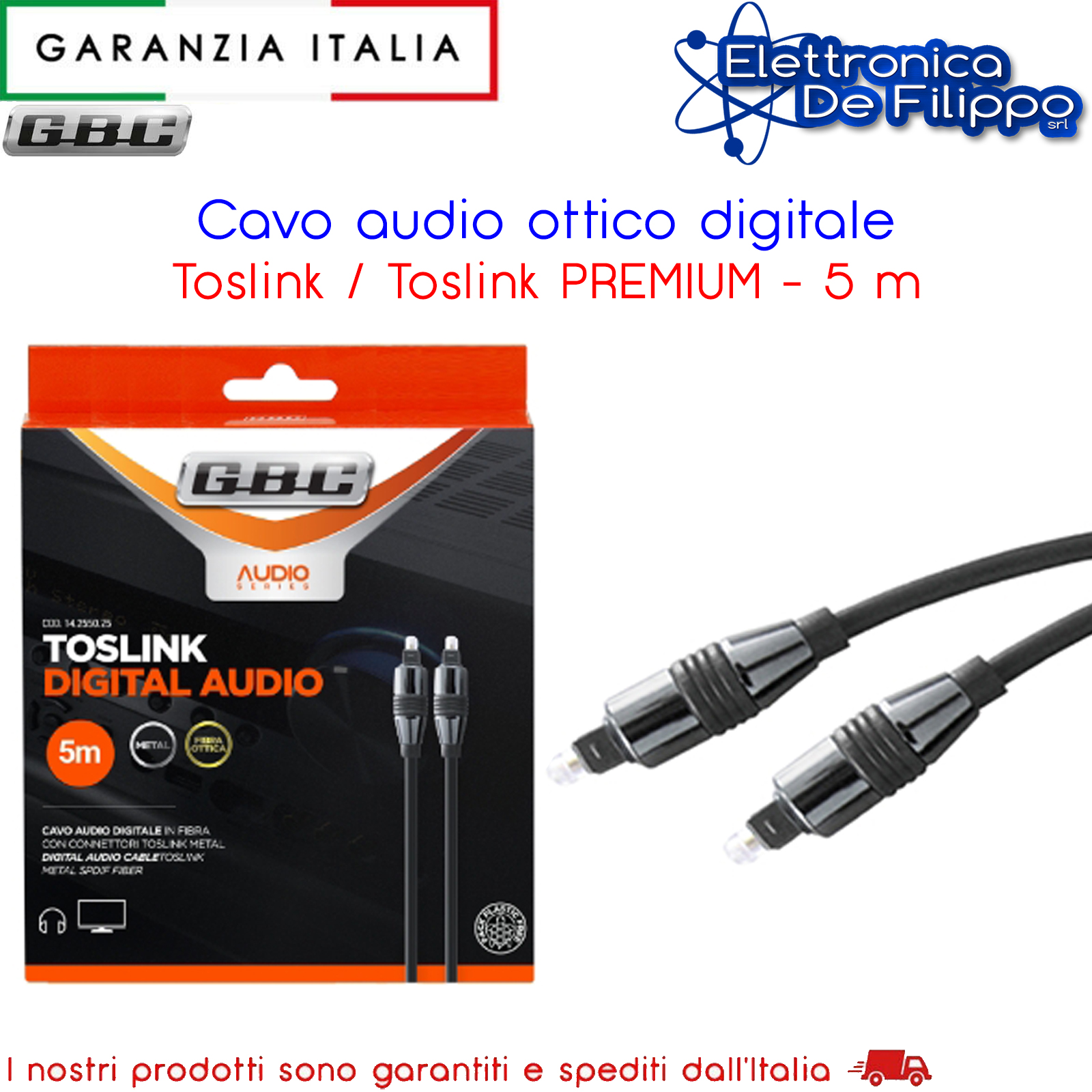 Cavo audio digitale in fibra ottica con connettori Toslink T (SPDIF) di qualità PREMIUM 5m. Ideale per la connessione dei sistemi Home Theatre alle TV di ultima generazione, garantisce un qualità audio di altissimo livello riducendo a zero la latenza delle trasmissioni; ideale per collegamenti professionali; i connettori metallici ne garantiscono la resistenza all'uso.