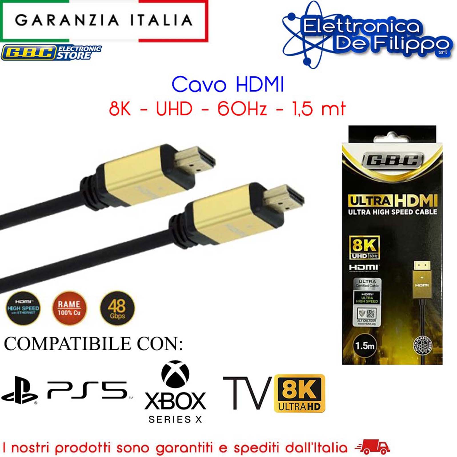 Cavi HDMI Ultra High Speed 8K 48Gbps. Questa revisione dello standard HDMI, oltre a supportare tutte le tecnologie precedenti, apporta considerevoli miglioramenti tecnici e implementa diverse tecnologie multimediali. La tecnologia Fixed Rate Link (FRL - retrocompatibile con TMDS) opera su 4 canali a 12Gbps, raggiungendo così una velocità totale di 48Gbps. Ciò consente di supportare una risoluzione massima di 10K (10240 x 4320 pixel) a 100 / 120 fps, con rapporto d’aspetto 21:9. Sono supportate anche risoluzoni 4K (3840 x 2160 pixel) a 100 / 120 fps e 8K (7680 x 4320 pixel) a 100 / 120 fps. Fino a 8K 60 fps è garantito lo spazio colore YUV RGB 4:4:4. La possibilità di andare oltre i 60 fps permette di sfruttare High Frame Rate (HFR), cioè le sorgenti che raggiungono i 100 / 120 fps. Possibilità per ora interessante soprattutto per gli appassionati di videogiochi, ma in futuro anche per decoder e lettori multimediali. Supporta la nuova versione ARC, eARC, oltre a CEC, per segnali non compressi fino a 7.1 canali con una frequenza di campionamento fino a 192 kHz / 24-bit. Supporta perciò formati come Dolby TrueHD, DTSHD Master Audio, Dolby Atmos e DTS:X. Supporta HDR con metadati dinamici. I cavi HDMI Ultra di GBC hanno conduttori in puro rame e connettori in alluminio dorato per garantire la massima conduttività e purezza del segnale