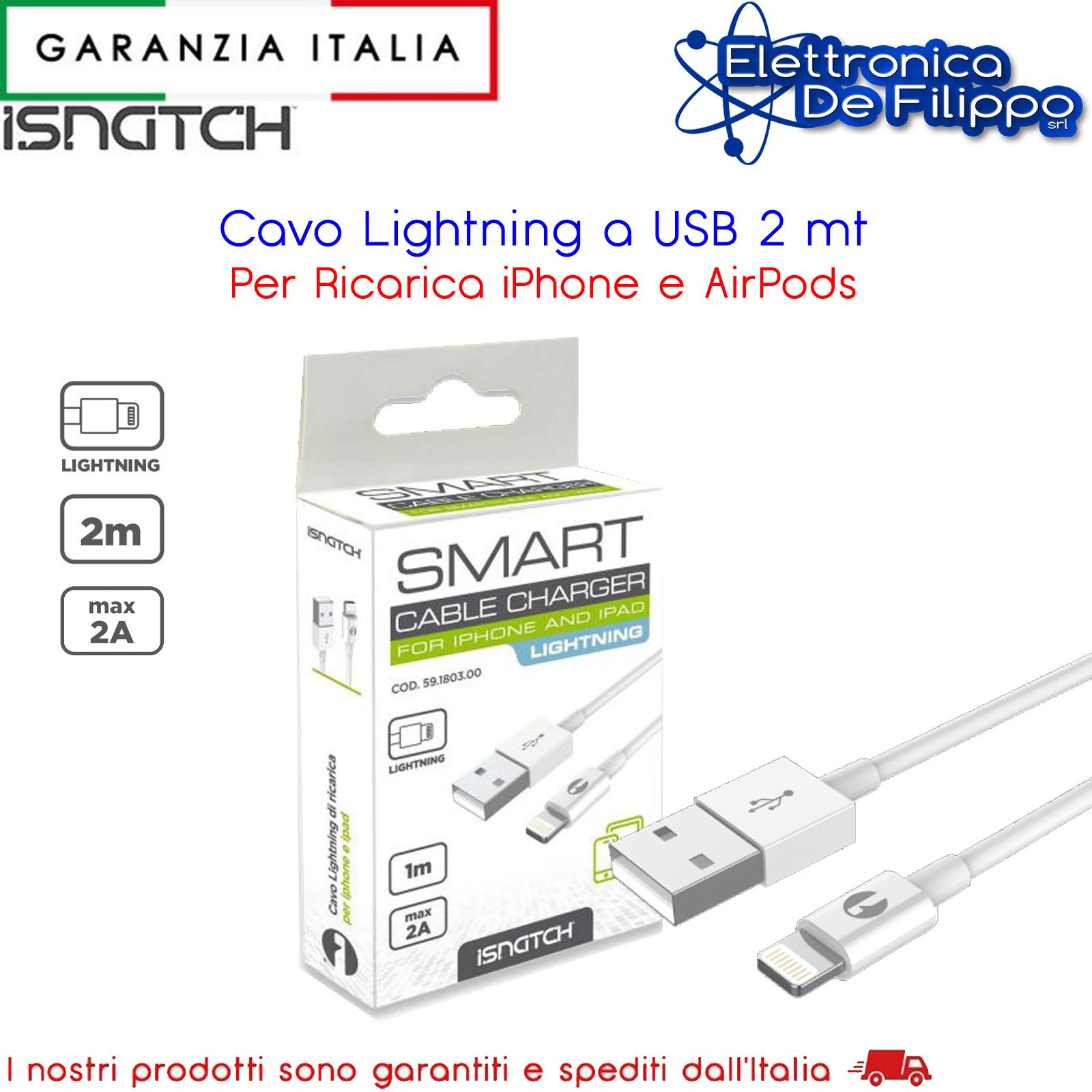 Cavo da connettore "Lightning" a USB 2.0 permette la ricarica di dispositvi Apple. Colore bianco, lunghezza 2 metri