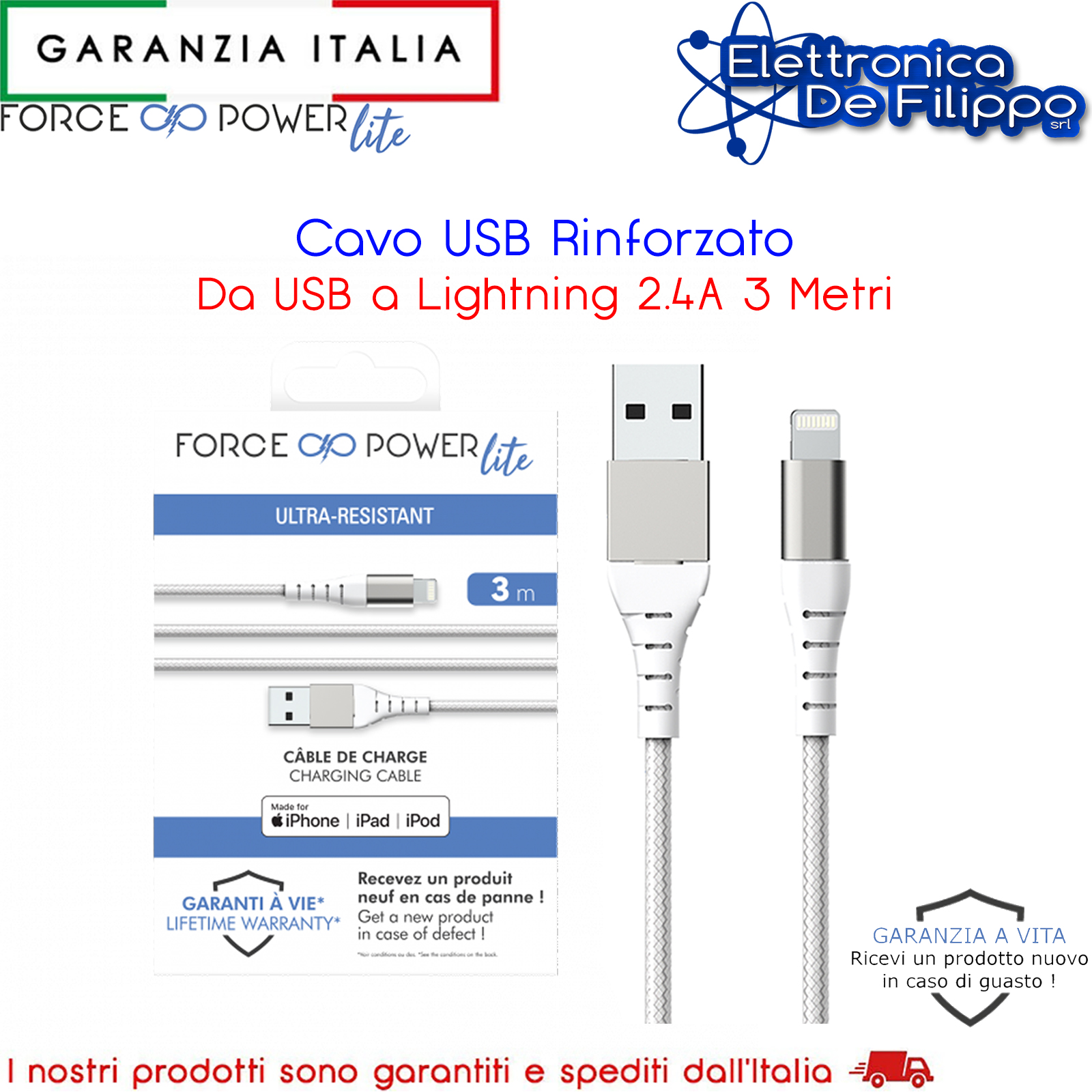 • Contenuto della confezione: 1 cavo USB A/Lightning da 3 m + Garanzia a vita
