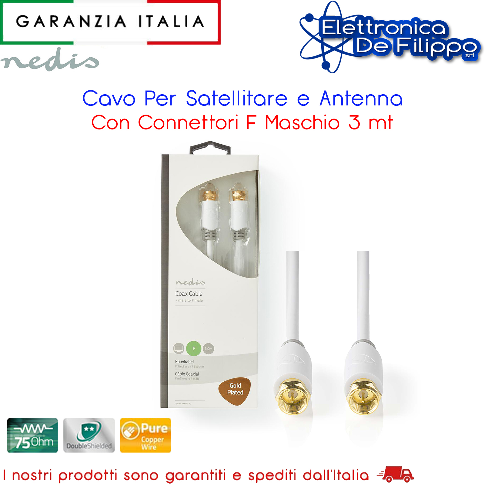 Un cavo satellitare con connettori F maschio è un cavo coassiale utilizzato per collegare dispositivi come decoder satellitari, televisori o antenne paraboliche a una fonte satellitare. Il connettore F maschio è uno dei tipi di connettori utilizzati per connessioni RF (radiofrequenza) ed è comunemente utilizzato in applicazioni satellitari. Questo tipo di cavo e anche progettato per collegare un'antenna digitale terrestre (ad esempio, un'antenna per la ricezione di segnali televisivi terrestri) a un dispositivo come una TV, un decoder o un sintonizzatore TV digitale. I connettori F sono comunemente utilizzati per collegare antenne terrestri e sono noti per offrire una connessione affidabile e resistente alle interferenze. Questi cavi sono progettati per trasportare segnali digitali terrestri, come quelli trasmessi da stazioni televisive terrestri.