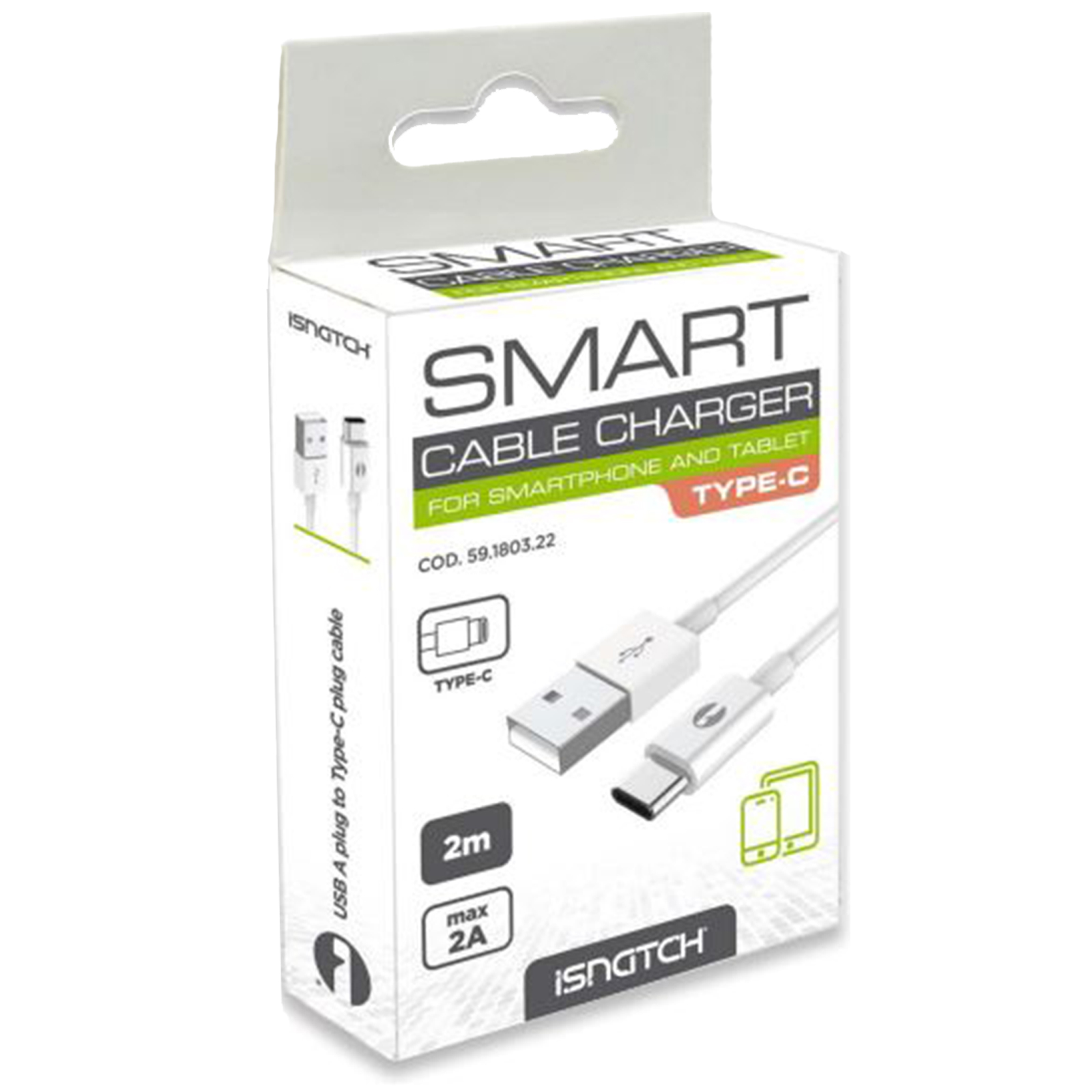 Cavo da USB Type-C a USB 2.0 per la ricarica di Smartphone e altre periferiche, con l'ultima generazione di connettori USB. Colore bianco, lunghezza 2 metri