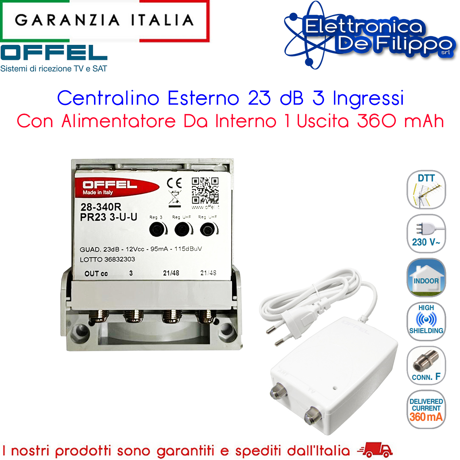 Amplificatore da palo 3 ingressi UHF 1 uscita 23dB regolabile Amplificatore larga banda per esterno, utilizzato in impianti singoli o piccoli impianti di ricezione Progettato per ottimizzare l'amplificazione dei segnali DTT compresi nel range E05÷E48, attenuando la banda LTE 700 MHz senza precludere il buon funzionamento del canale E48 Dotato di due ingressi larga banda amplificati 3+UHF Ogni ingresso è dotato di trimmer resistivo (0÷15 dB) come regolatore di livello per la banda 3+UHF Realizzato in contenitore schermato dotato di connettori a vite tipo F L'amplificazione delle bande 3 e UHF è realizzata a linea unica