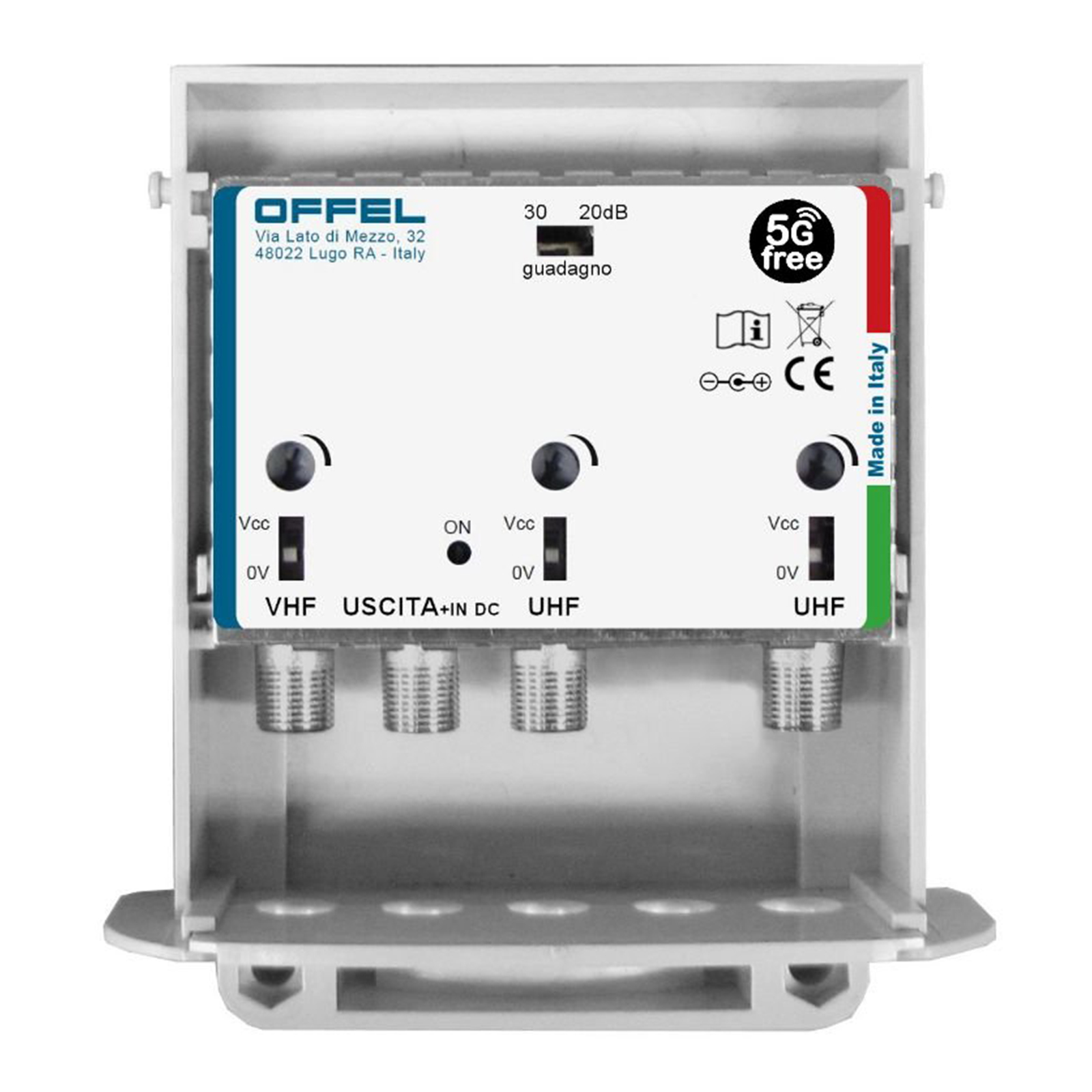 Centralino larga banda per esterno, adatto per impianti di ricezione di medie dimensioni. Progettato per ottimizzare l'amplificazione dei segnali DTT compresi nel range E05÷E12+E21÷E48, attenuando la banda 700 MHz senza precludere il buon funzionamento del canale E48. Ideale per adattarsi a diverse soluzioni di impianto grazie ad un selettore a due step che consente di impostare il guadagno massimo su tutta la banda UHF a 20 o 30 dB. La banda VHF, invece, ha guadagno massimo 30 dB.